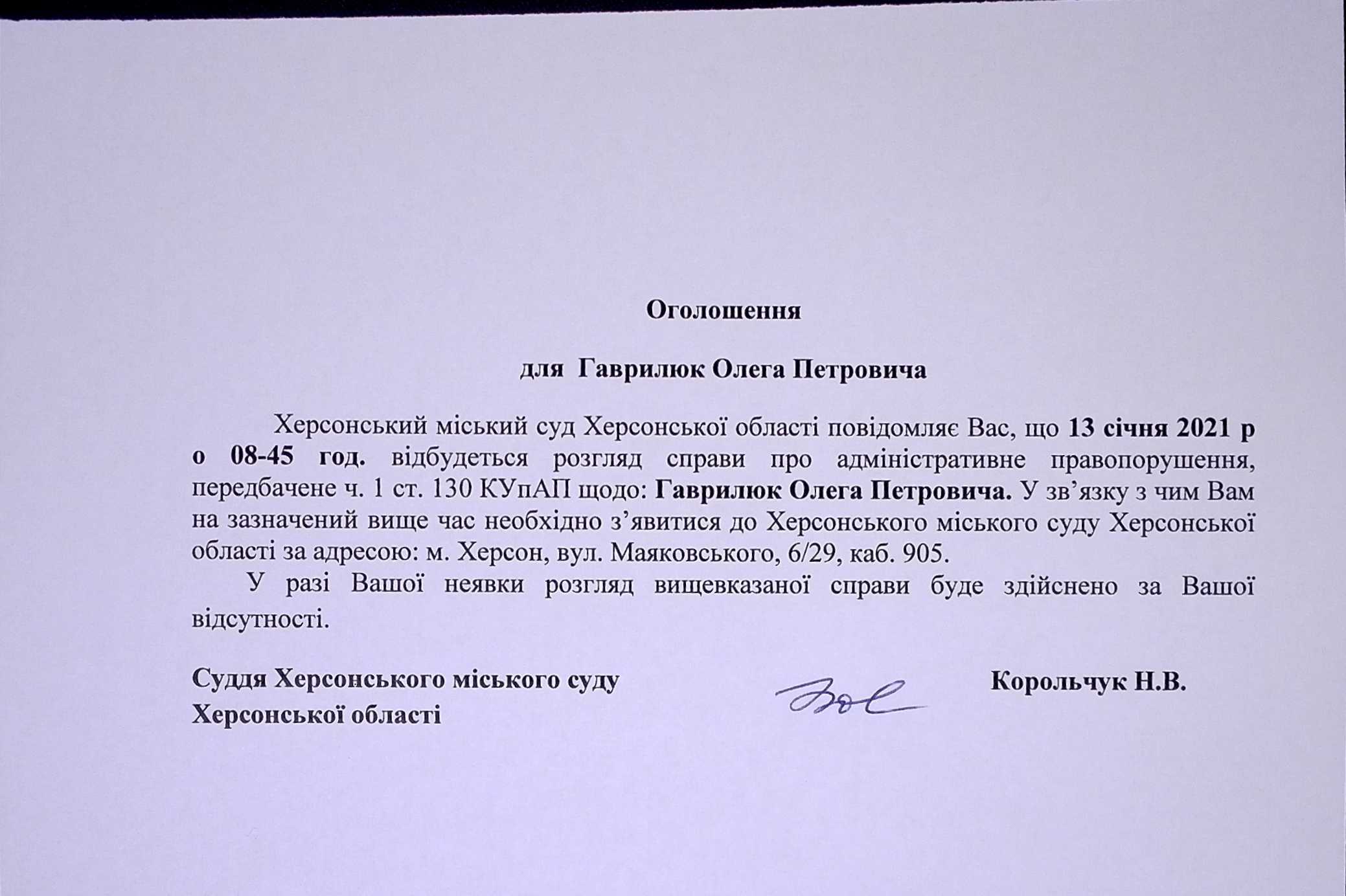 ОГОЛОШЕННЯ для Гаврилюк Олега Петровича