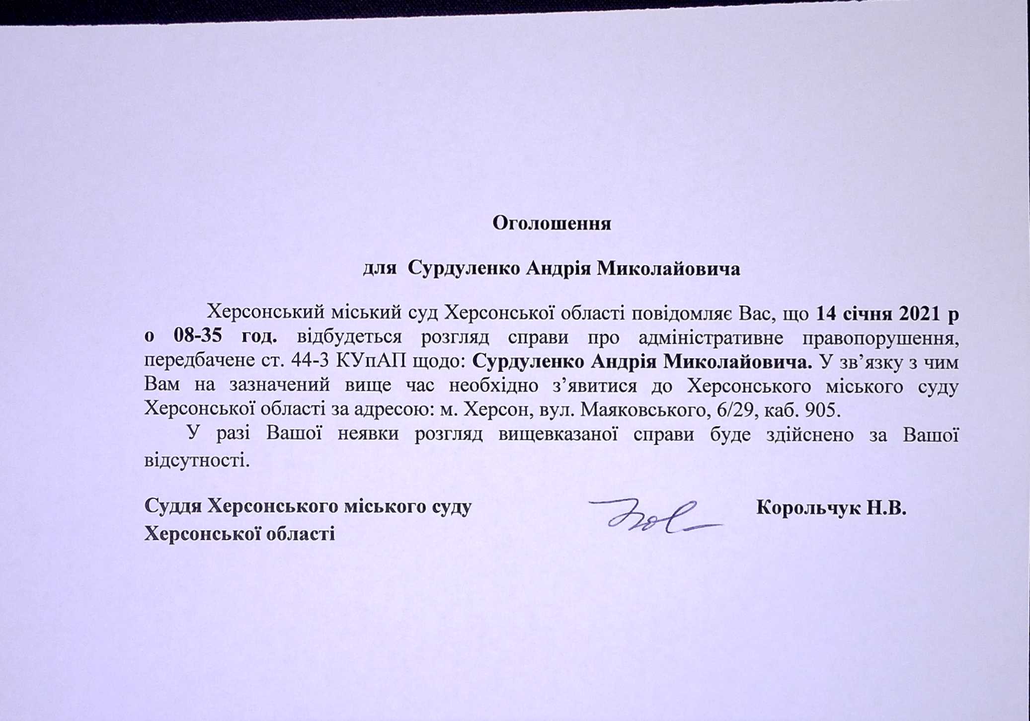 ОГОЛОШЕННЯ для Сурдуленко Андрія Миколайовича