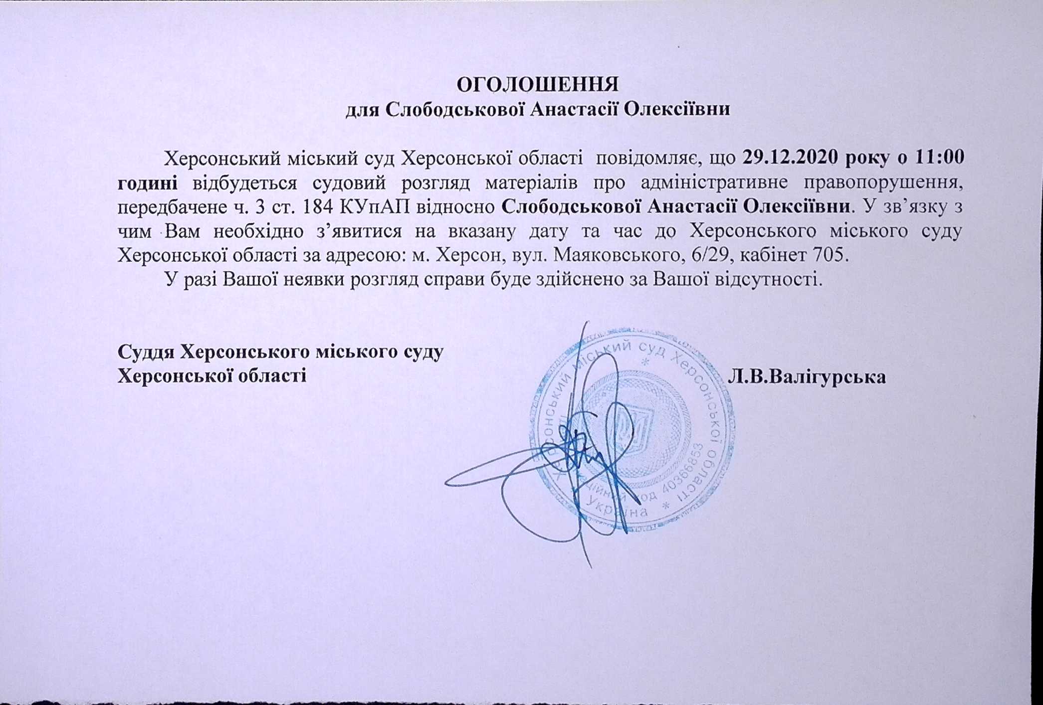 ОГОЛОШЕННЯ для Слободськової Анастасії Олексіївни