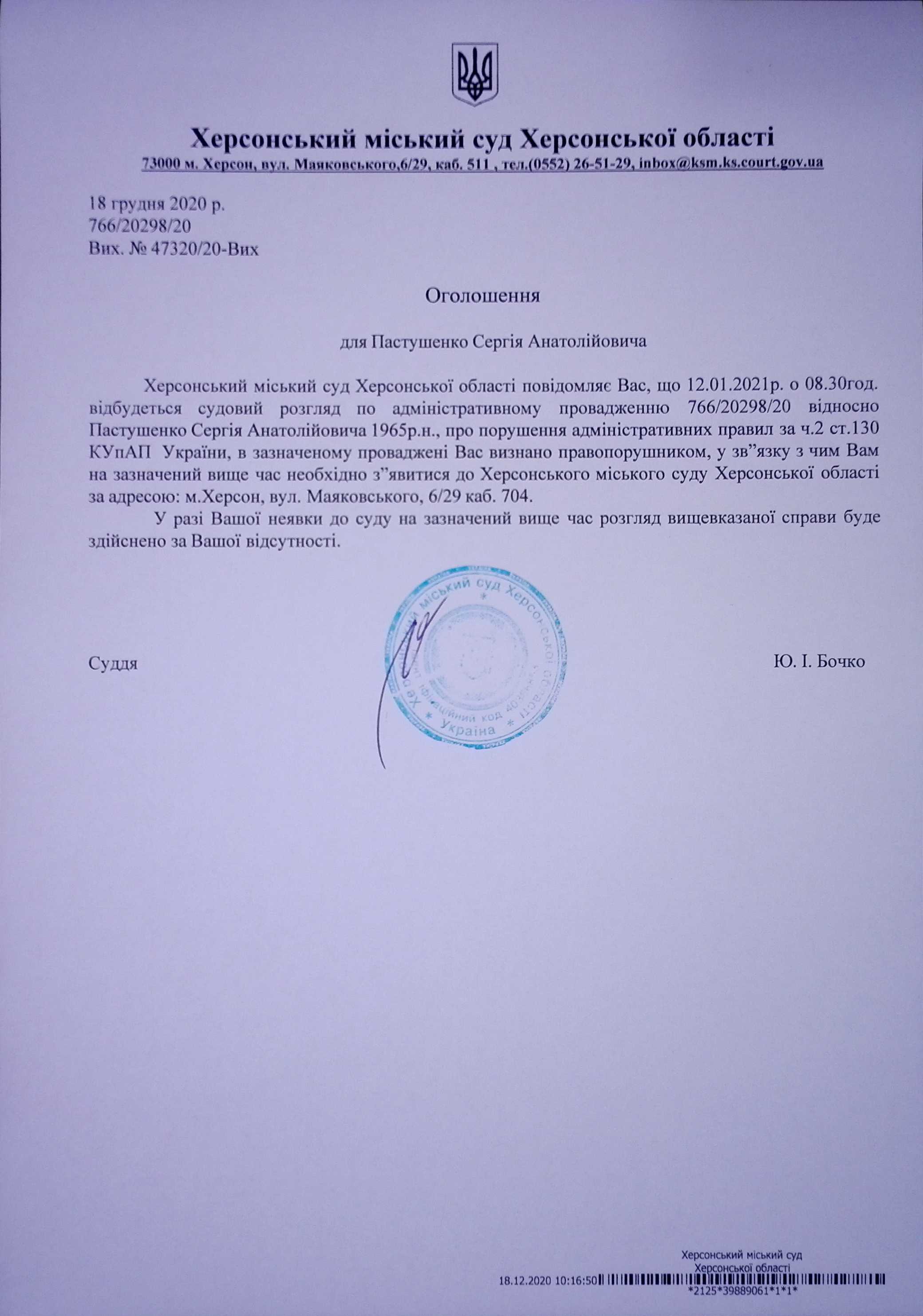 ОГОЛОШЕННЯ для Пастушенко Сергія Анатолійовича