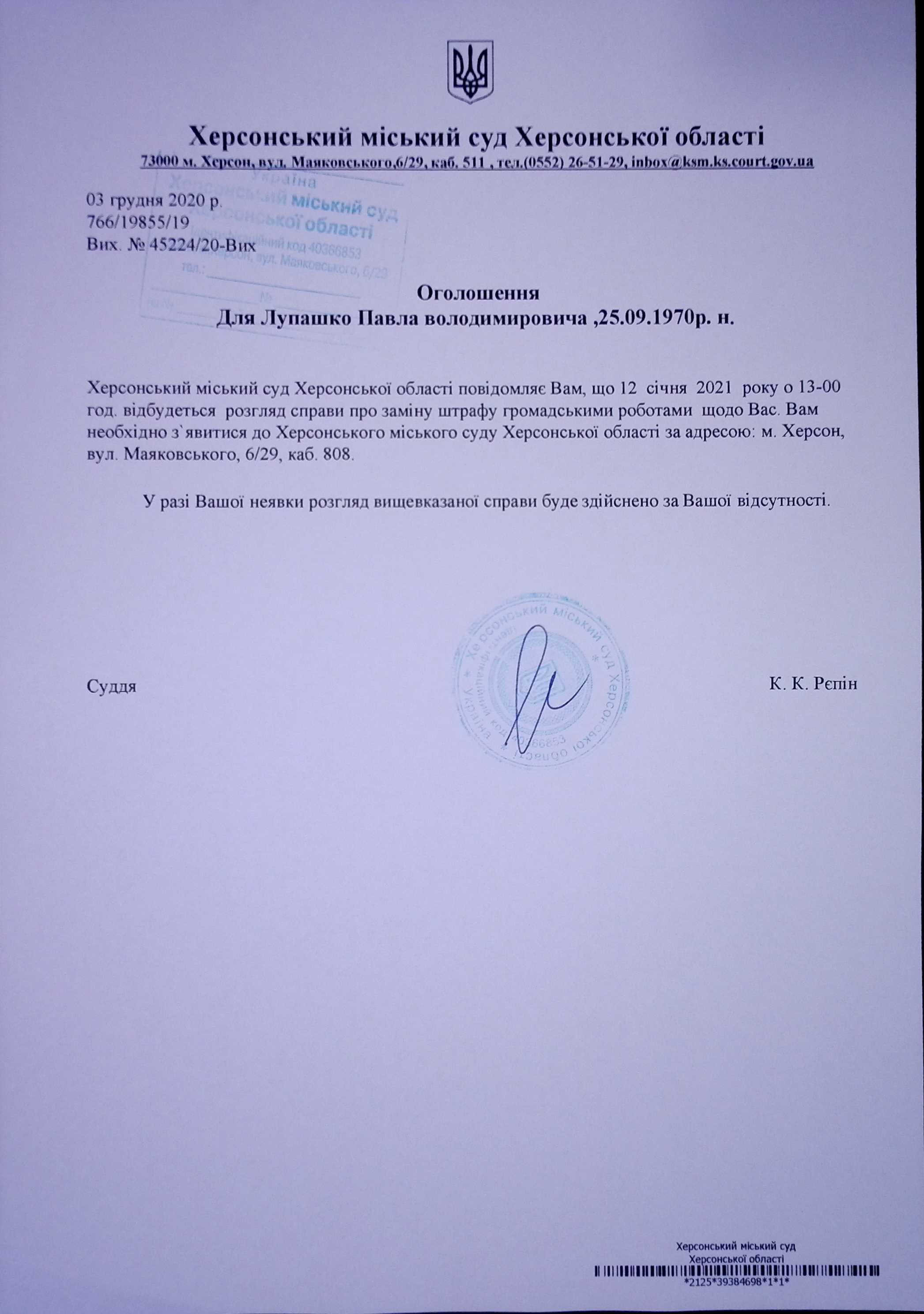 ОГОЛОШЕННЯ для Лупашко Павла Володимировича