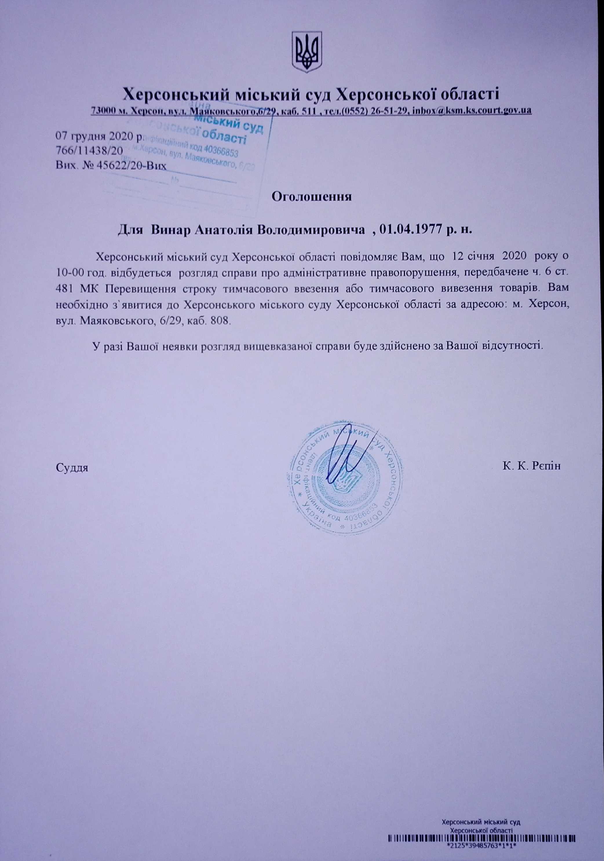 ОГОЛОШЕННЯ для Винар Анатолія Володимировича