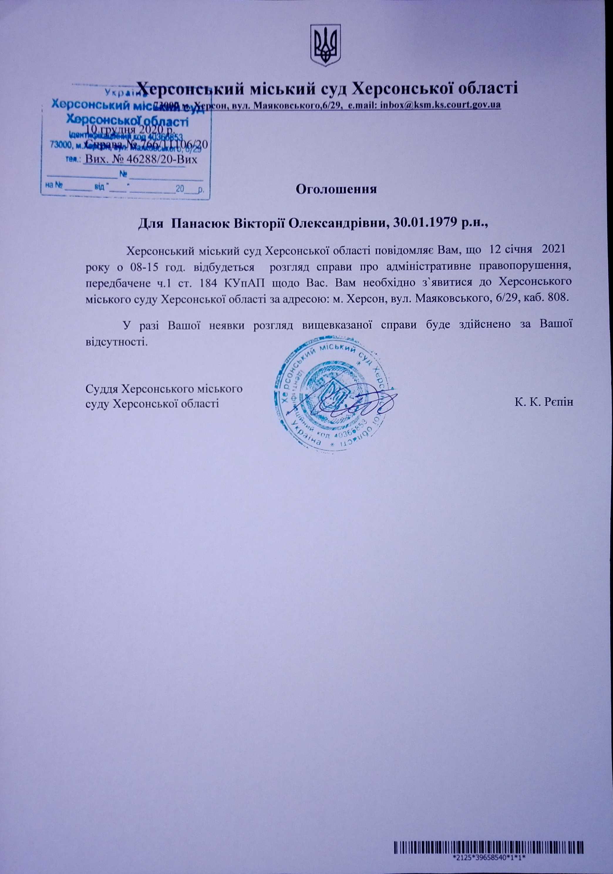ОГОЛОШЕННЯ для Панасюк Вікторії Олександрівни