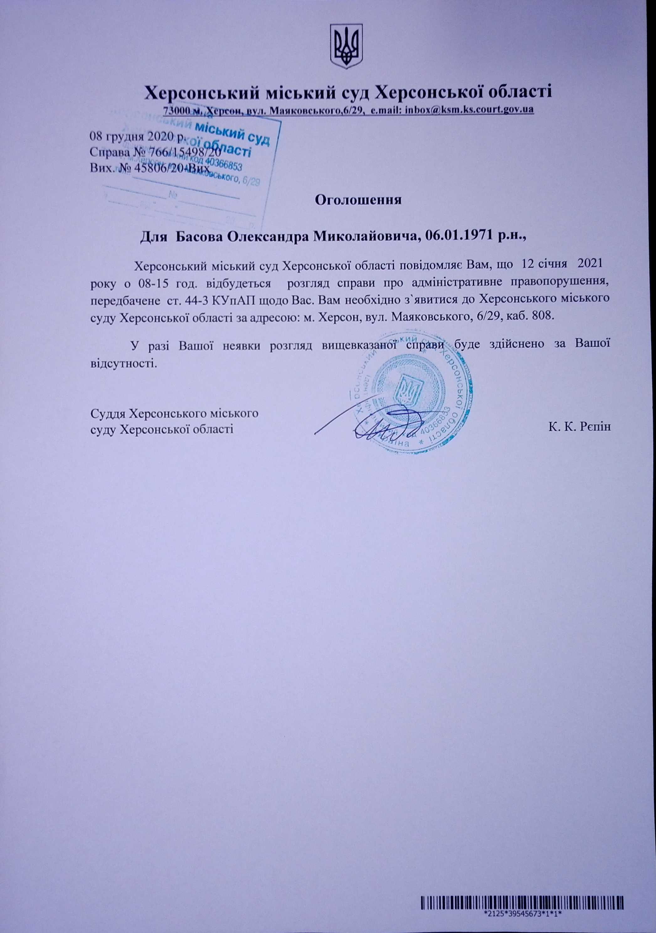 ОГОЛОШЕННЯ для Басова Олександра Миколайовича