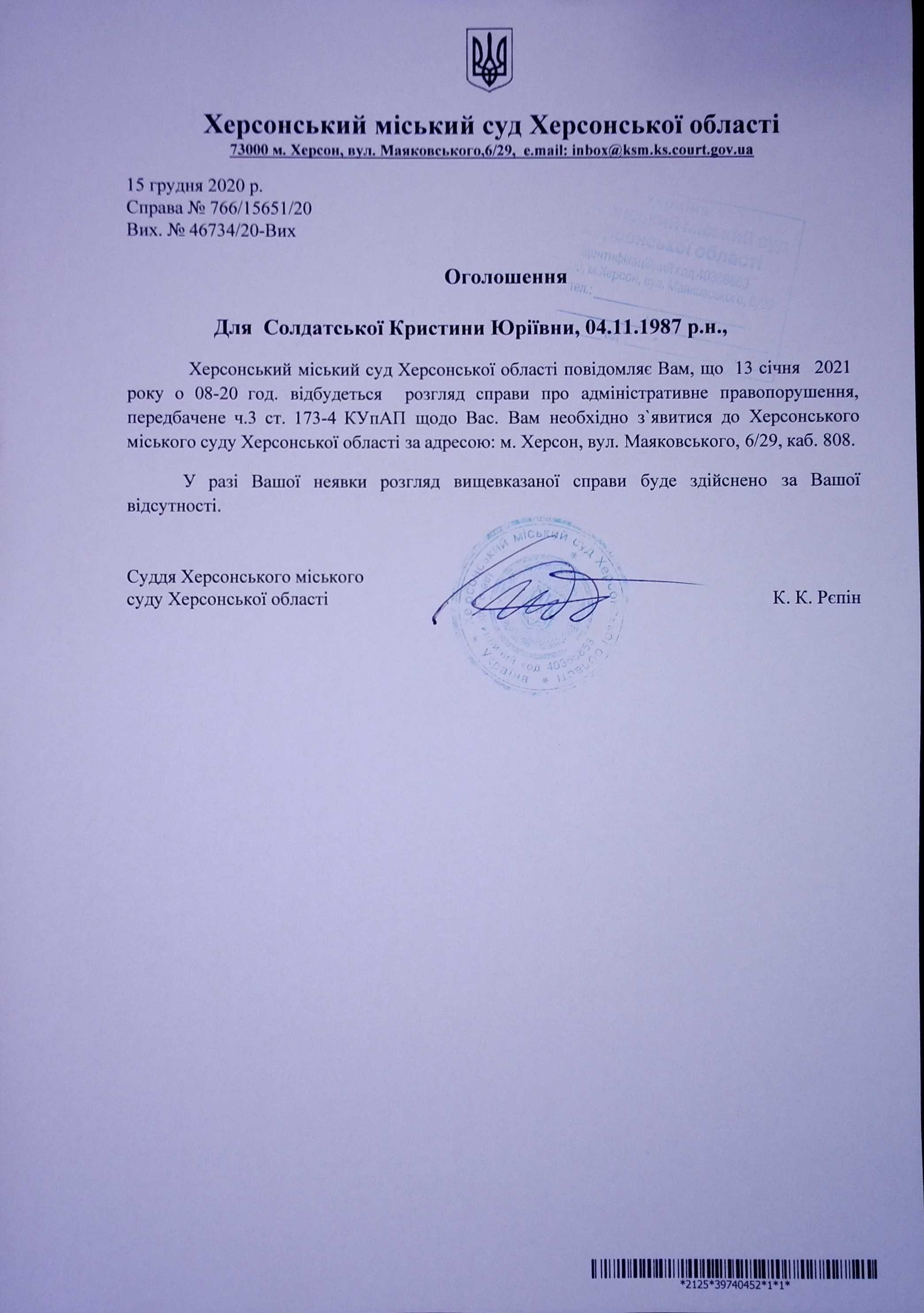 ОГОЛОШЕННЯ для Солдатської Кристини Юріївни
