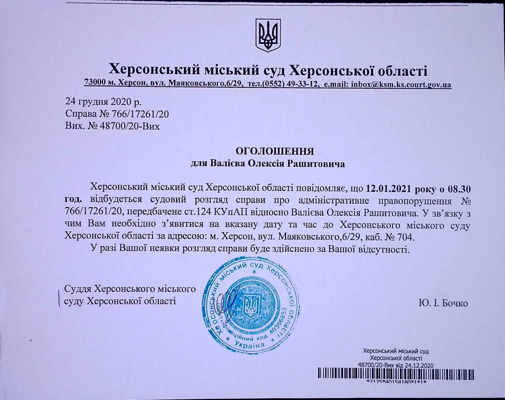 ОГОЛОШЕННЯ для Валієва Олексія Рашитовича