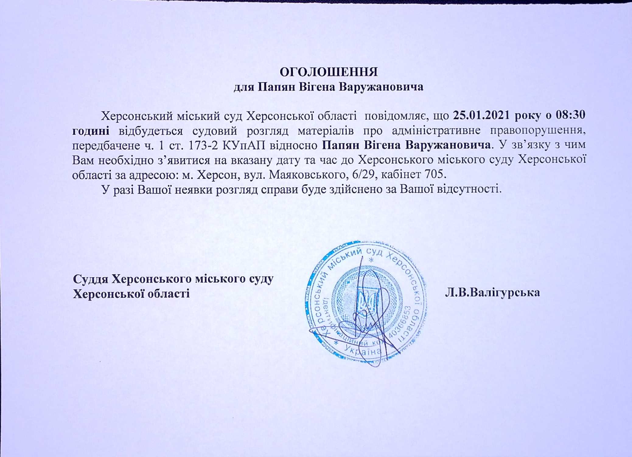 ОГОЛОШЕННЯ для Папян Вігена Варужановича