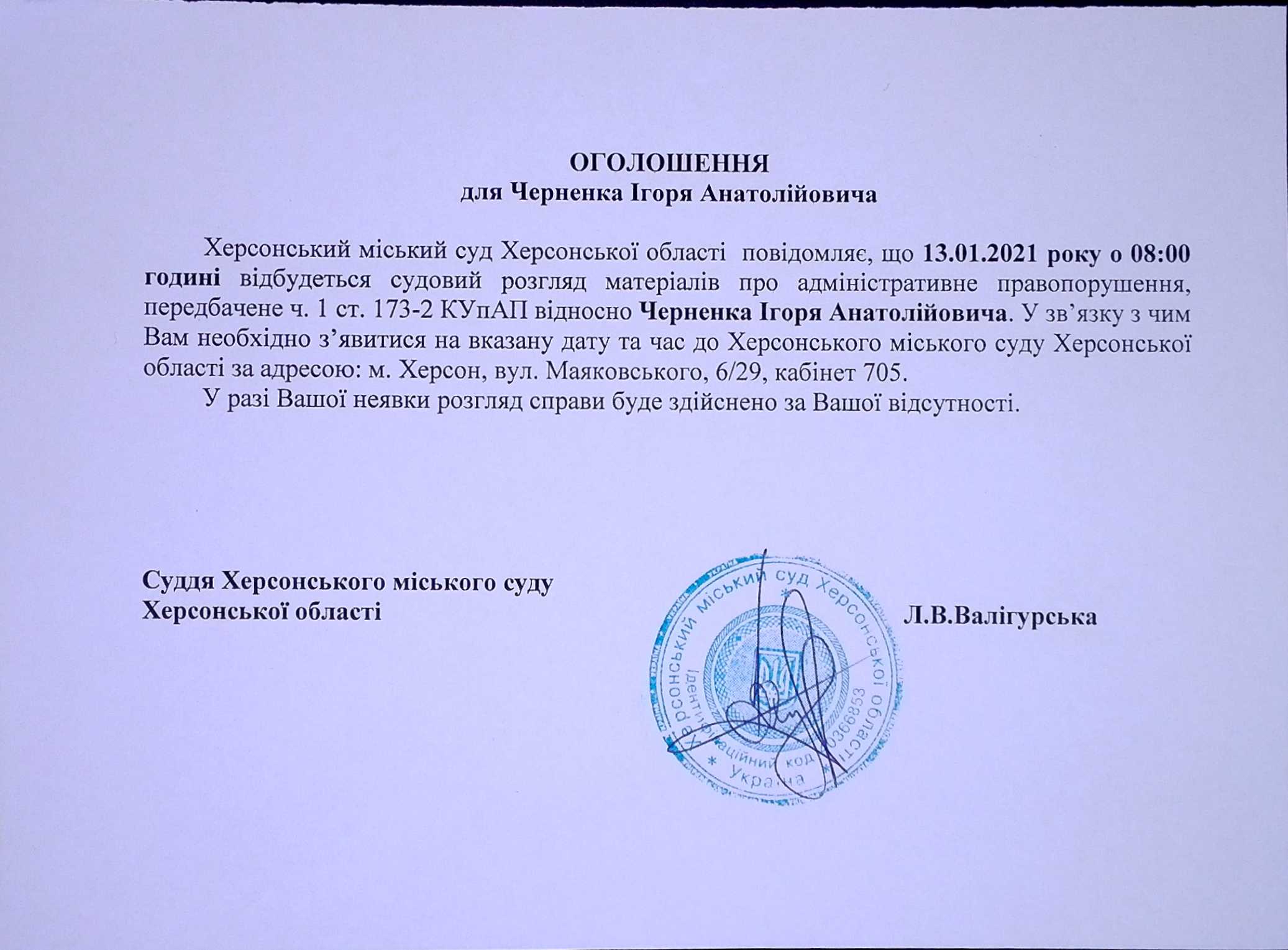 ОГОЛОШЕННЯ для Черненка Ігоря Анатолійовича
