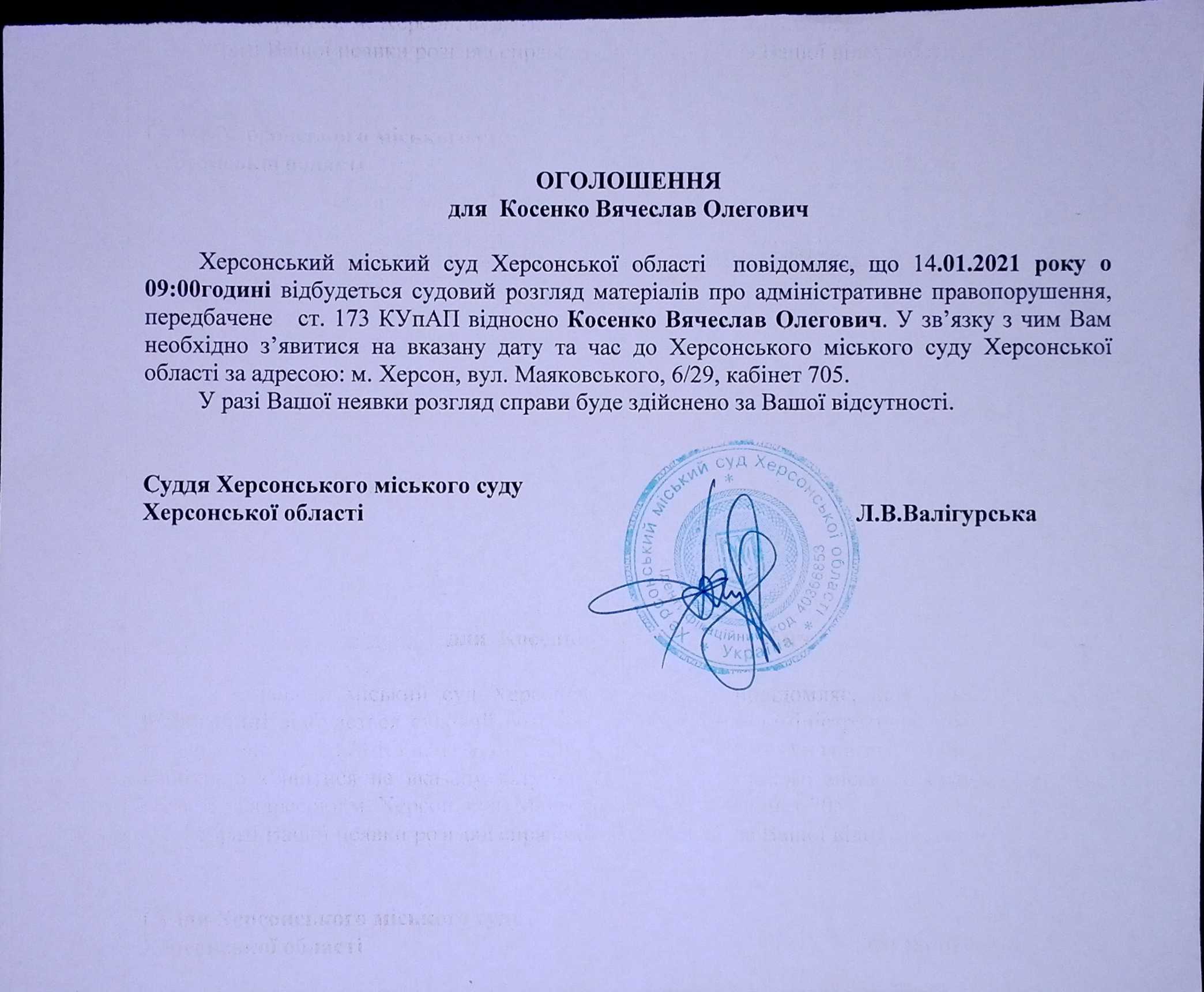 ОГОЛОШЕННЯ ПРО ВИКЛИК ДО СУДУ