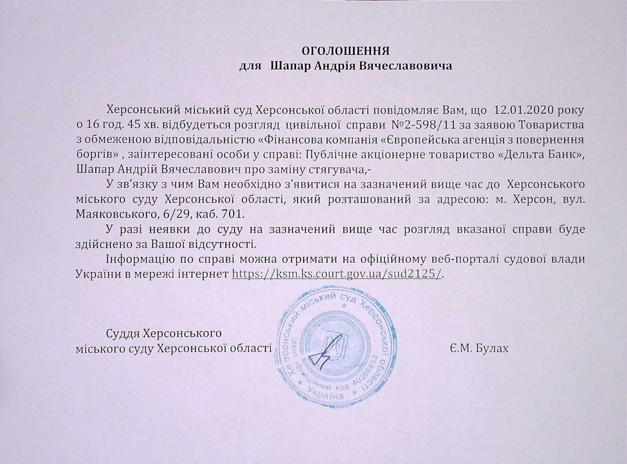 ОГОЛОШЕННЯ ПРО ВИКЛИК ДО СУДУ