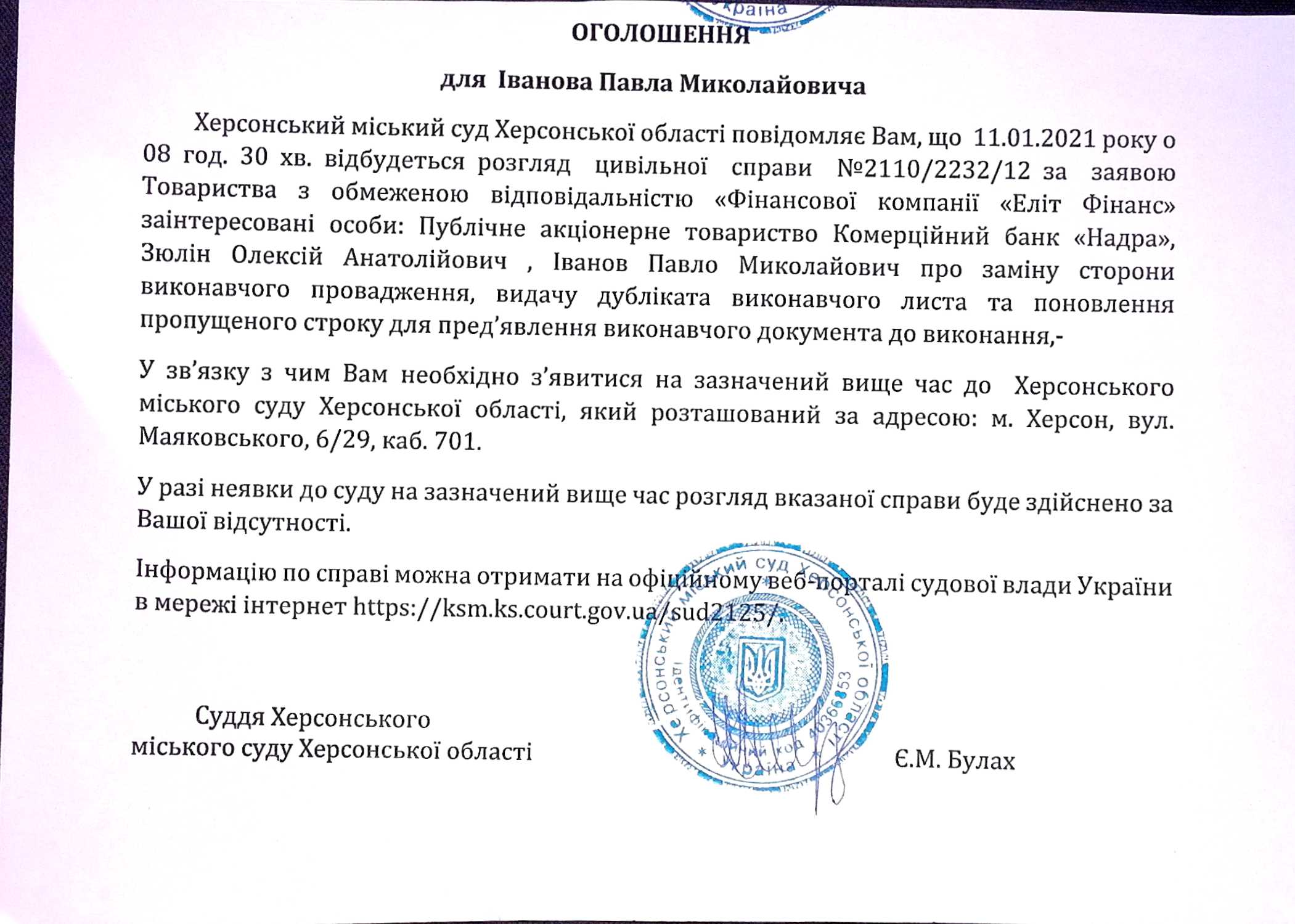 ОГОЛОШЕННЯ ПРО ВИКЛИК ДО СУДУ