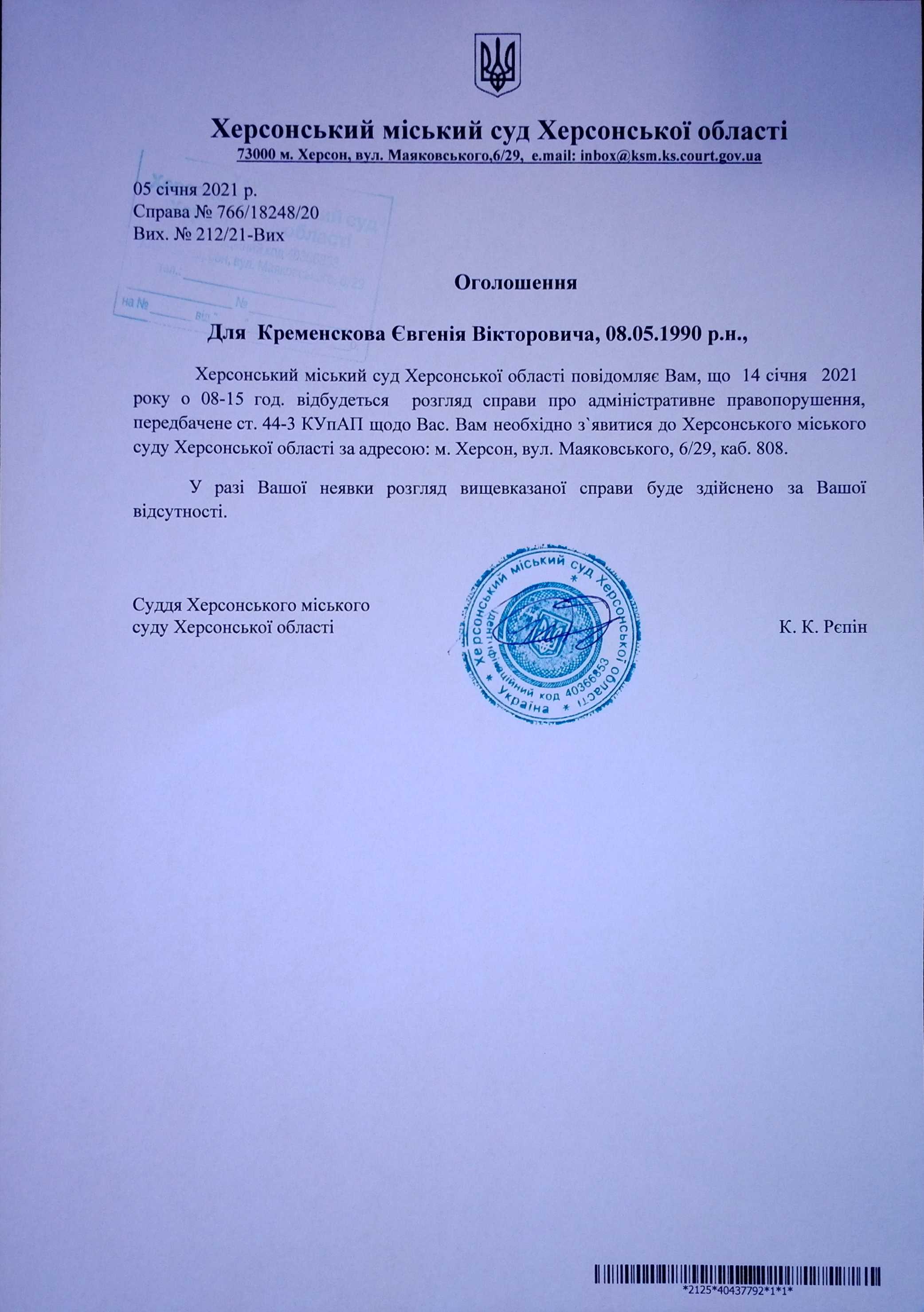 ОГОЛОШЕННЯ для Кременскова Євгенія Вікторовича