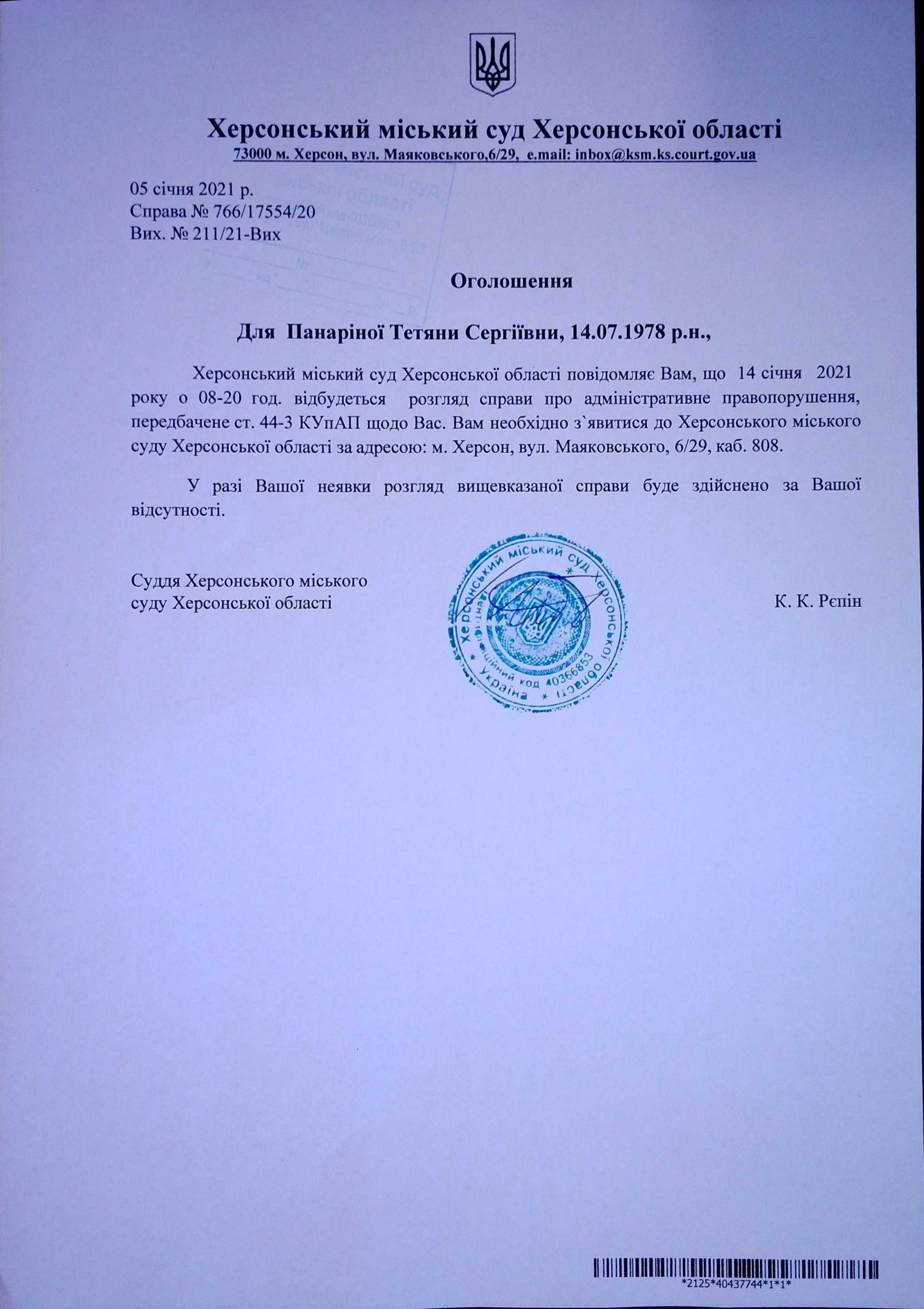 ОГОЛОШЕННЯ для Панаріної Тетяни Сергіївни