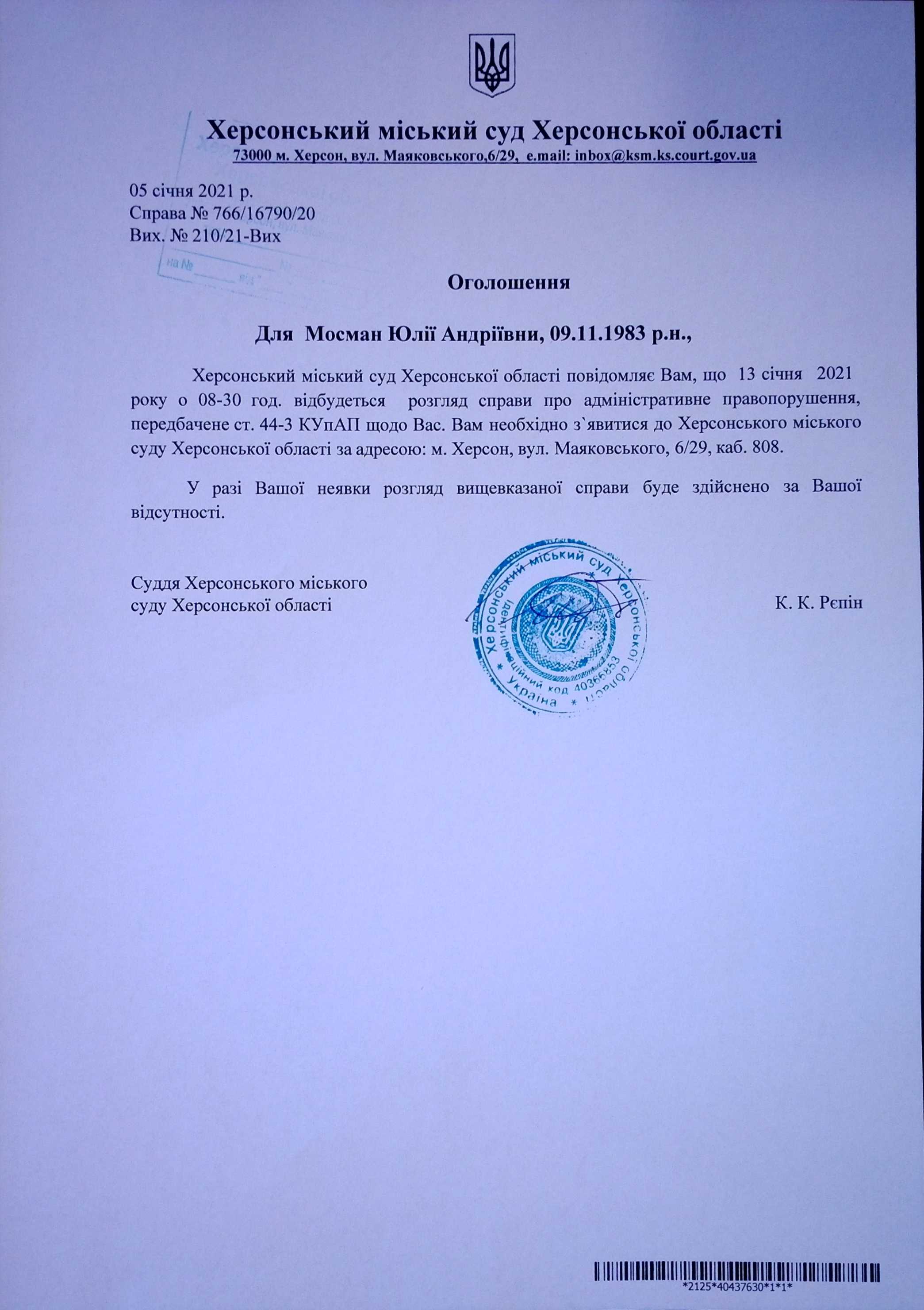 ОГОЛОШЕННЯ для Мосман Юлії Андріївни