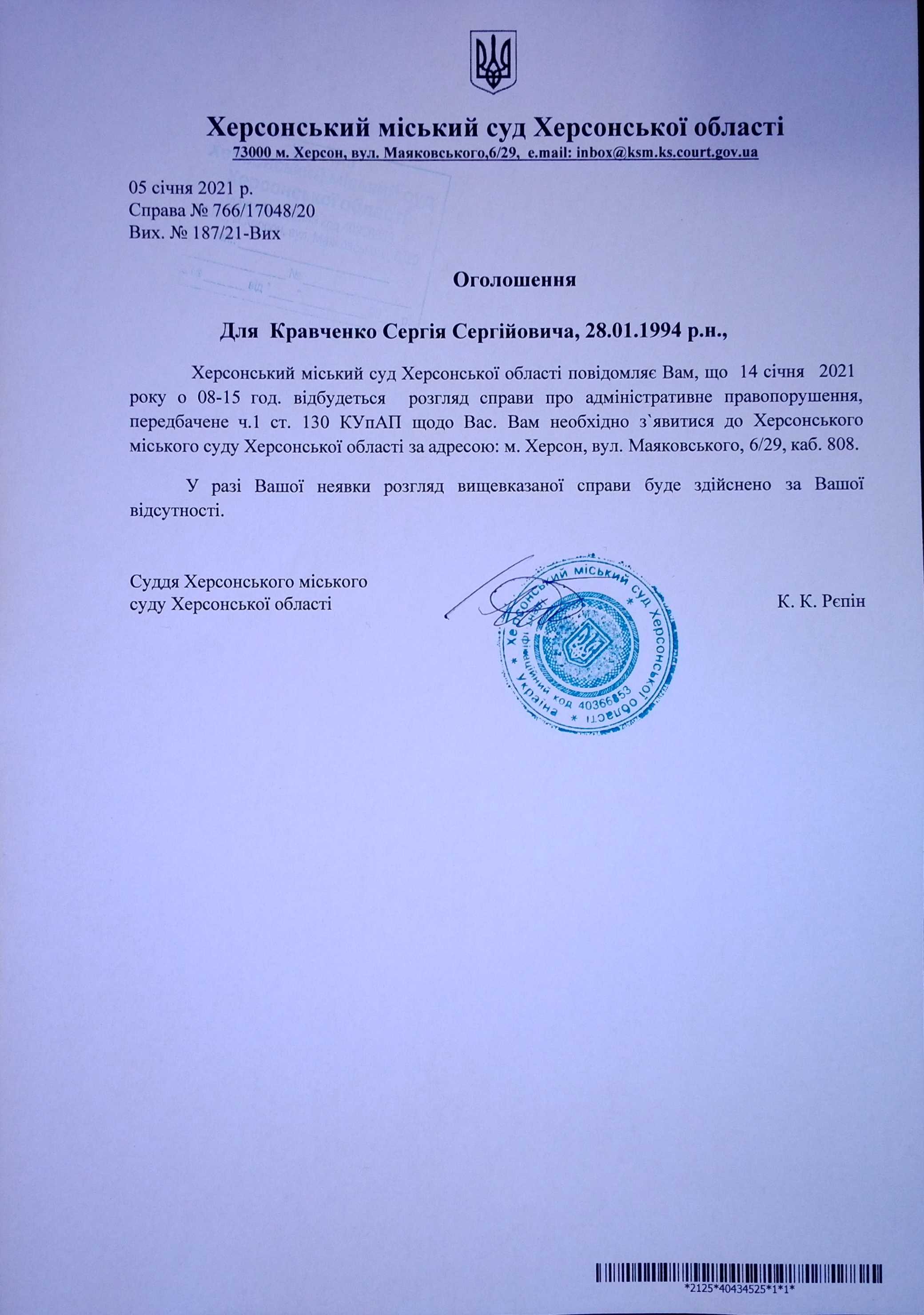 ОГОЛОШЕННЯ ПРО ВИКЛИК ДО СУДУ