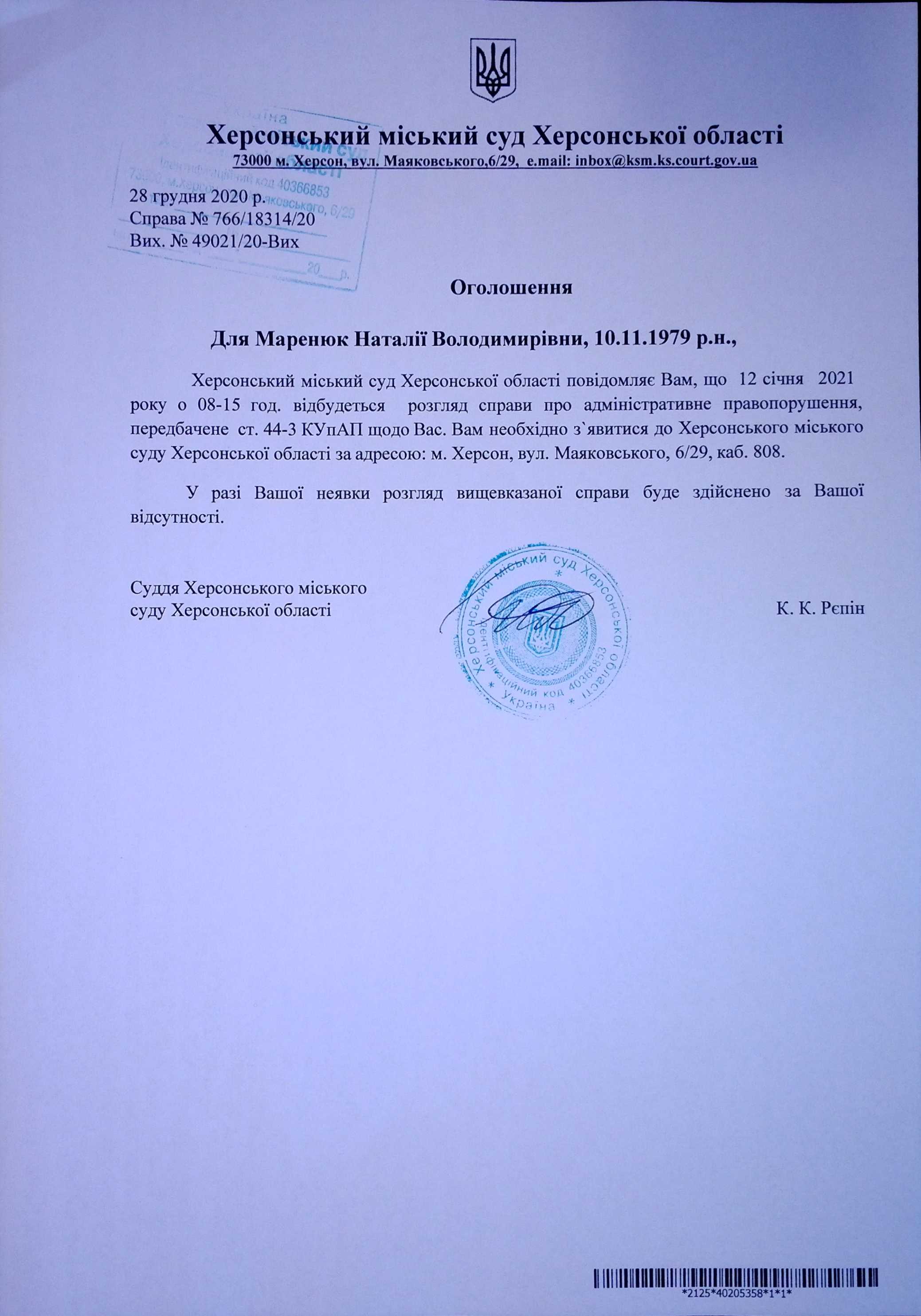 ОГОЛОШЕННЯ для Маренюк Наталії Володимирівни