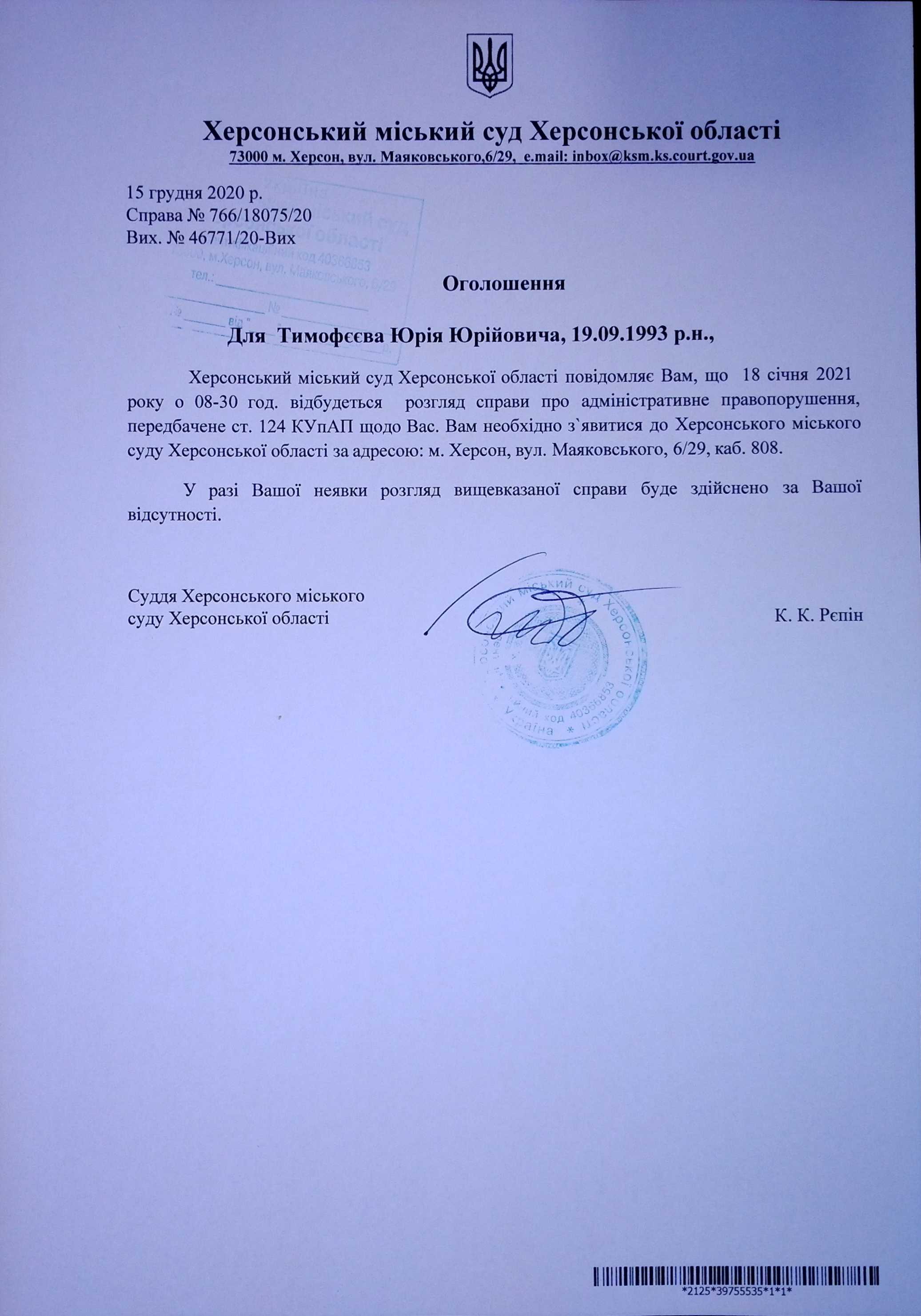 ОГОЛОШЕННЯ для Тимофєєва Юрія Юрійовича