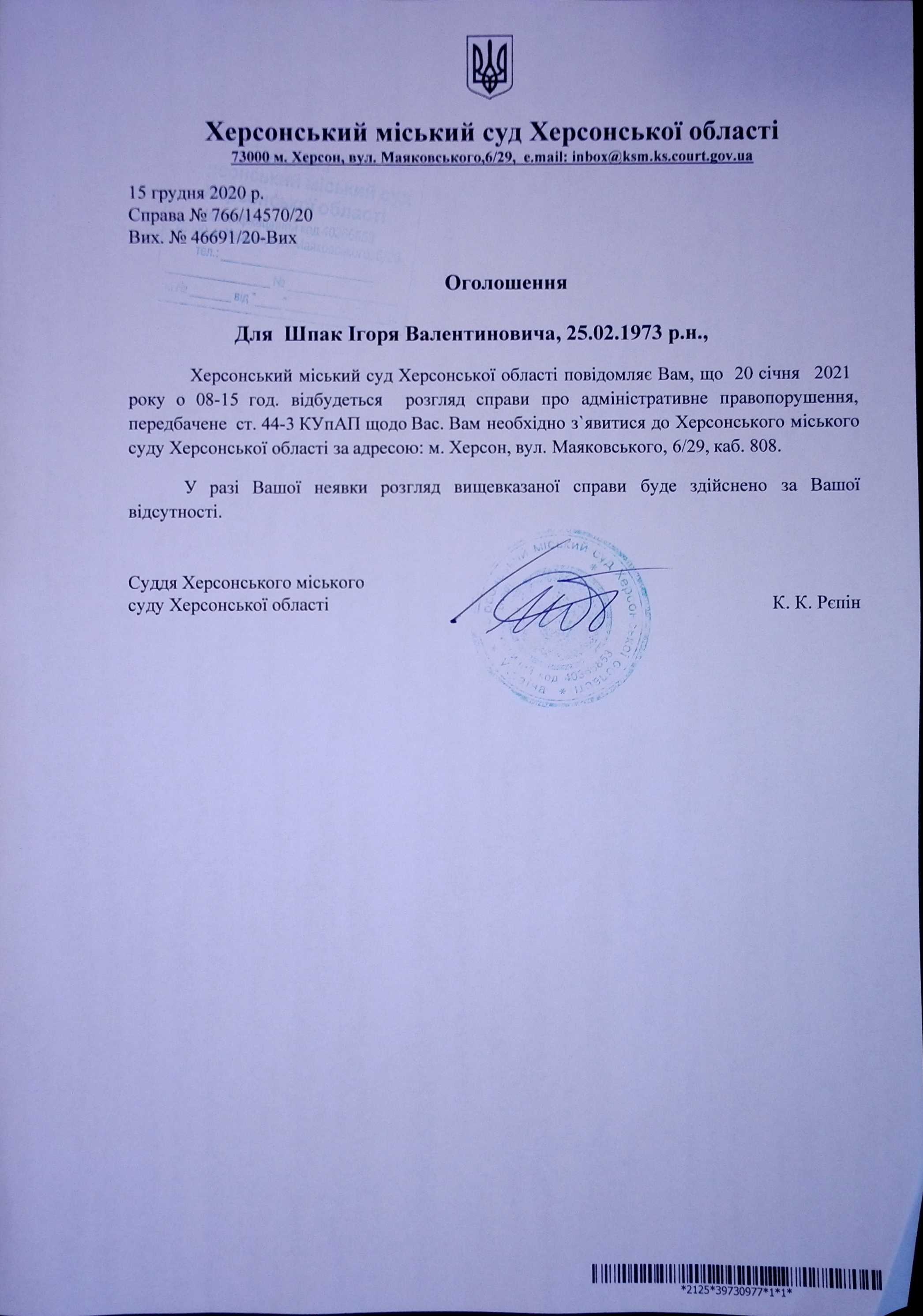 ОГОЛОШЕННЯ ПРО ВИКЛИК ДО СУДУ
