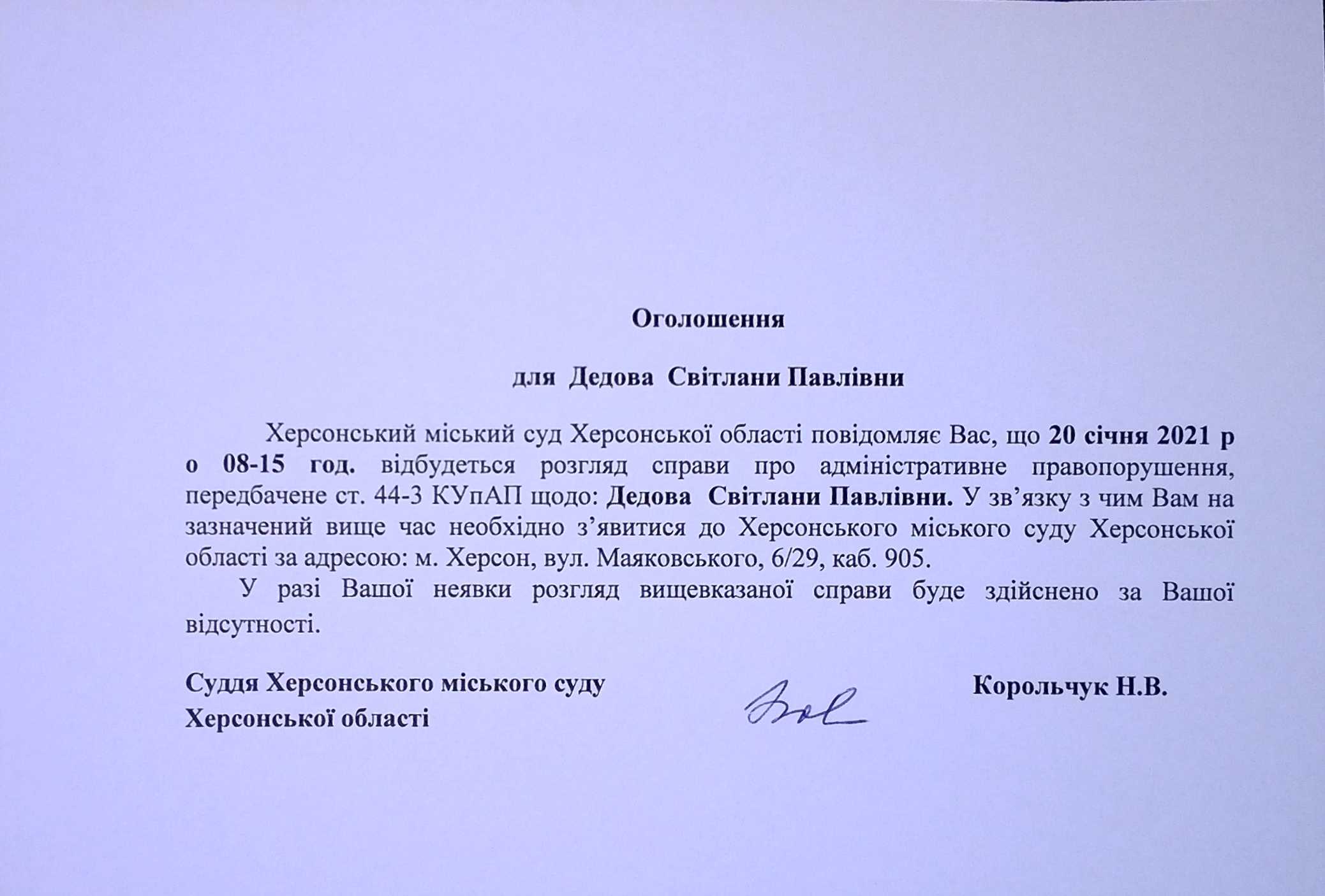 ОГОЛОШЕННЯ ПРО ВИКЛИК ДО СУДУ