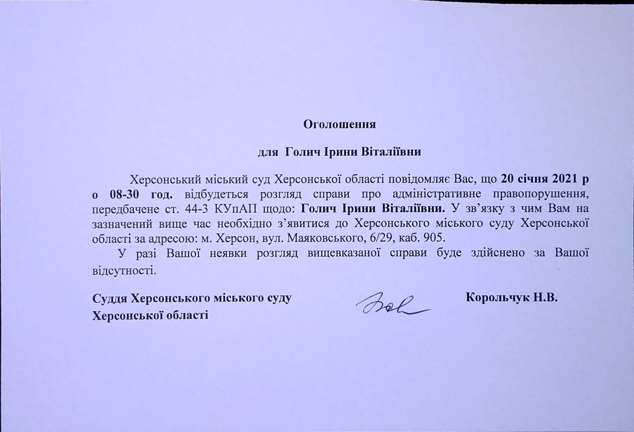 ОГОЛОШЕННЯ для Голич Ірини Віталіївни