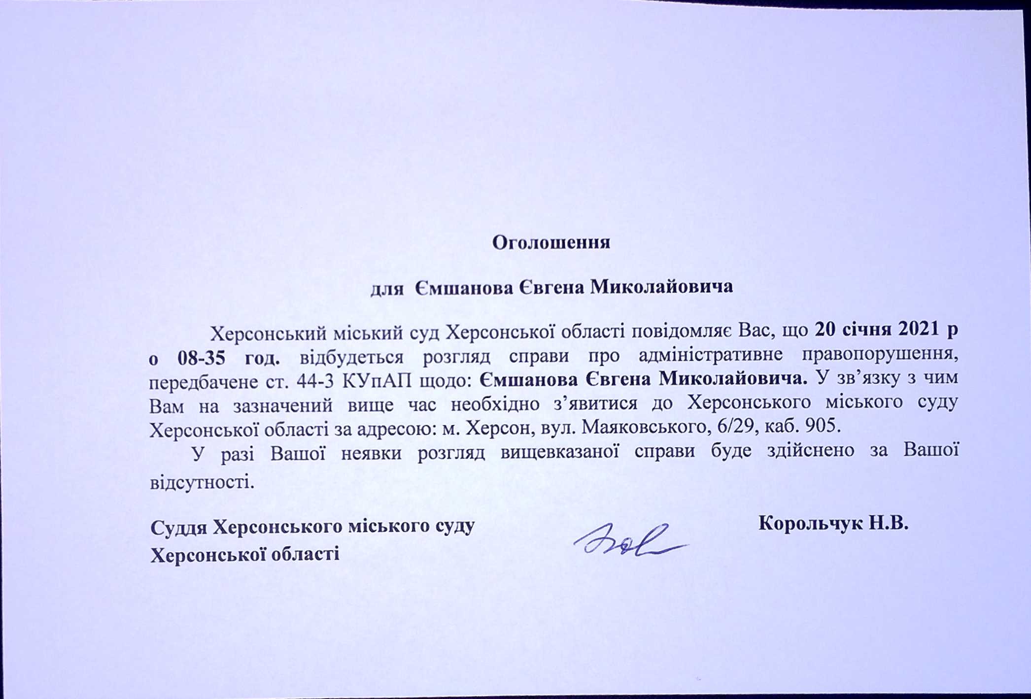 ОГОЛОШЕННЯ для Ємшанова Євгена Миколайовича