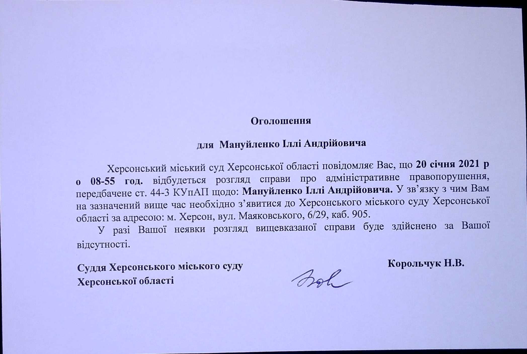 ОГОЛОШЕННЯ для Мануйленко Іллі Андрійовича