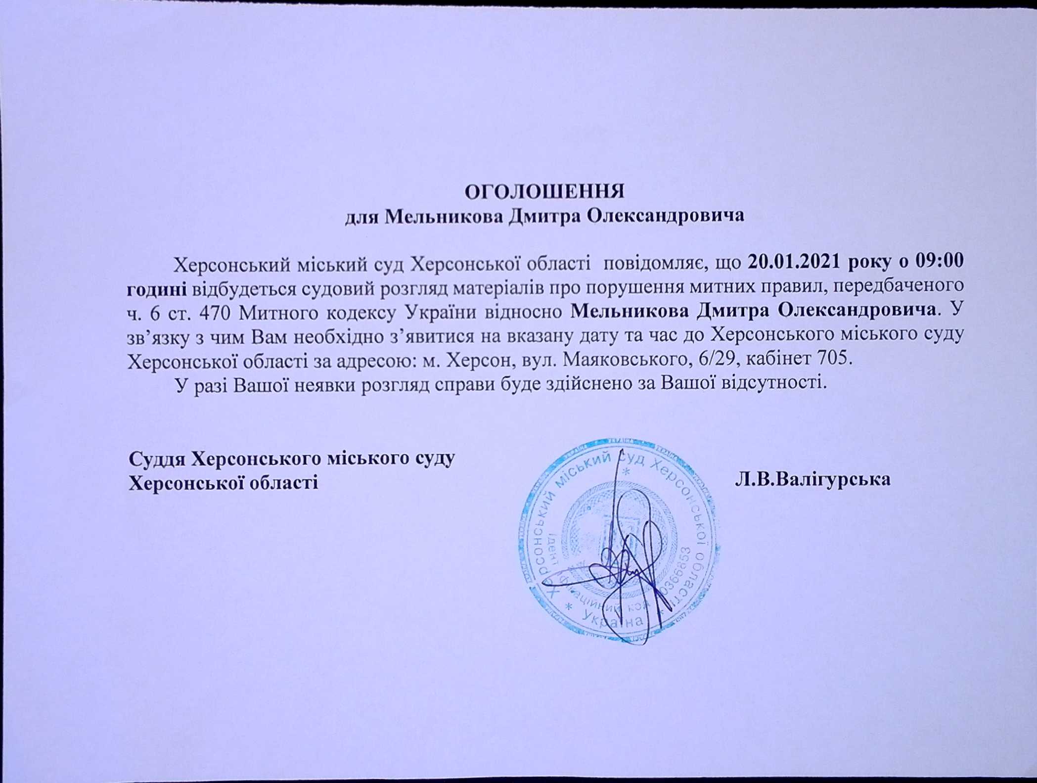 ОГОЛОШЕННЯ для Мельникова Дмитра Олександровича