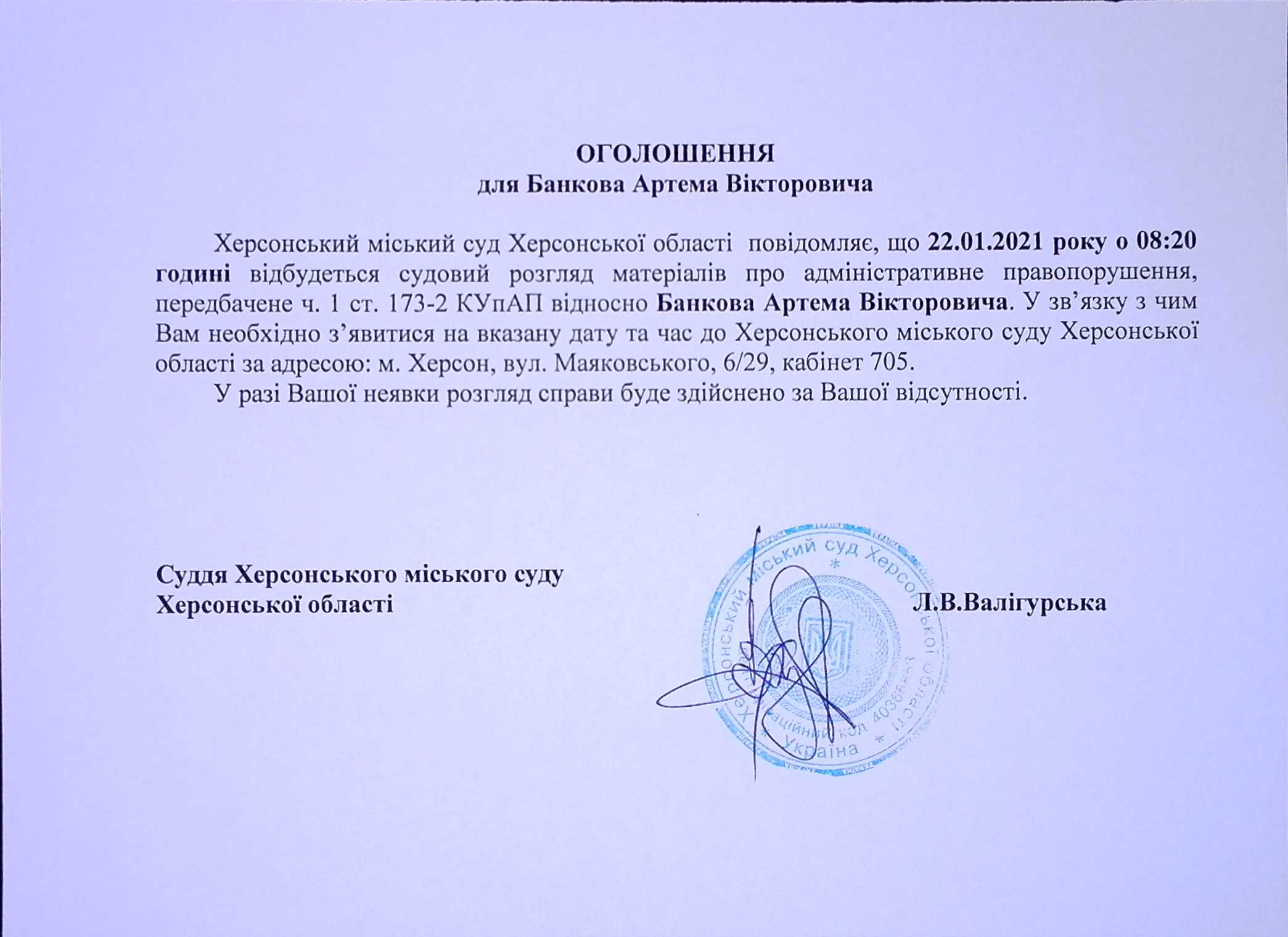 ОГОЛОШЕННЯ для Банкова Артема Вікторовича