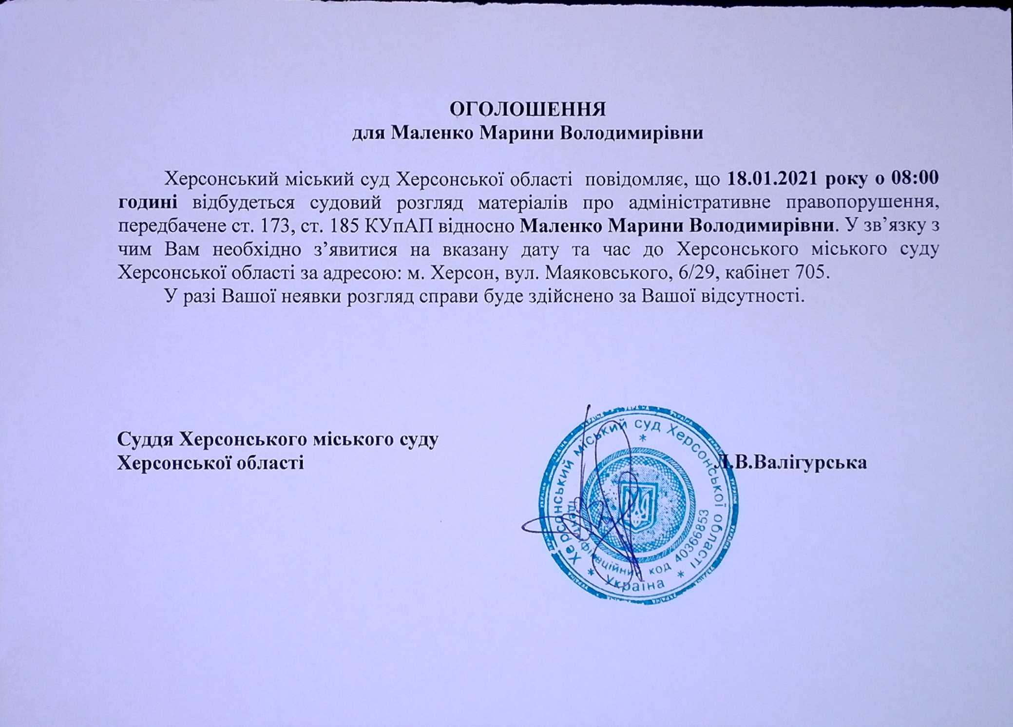 ОГОЛОШЕННЯ для Маленко Марини Володимирівни