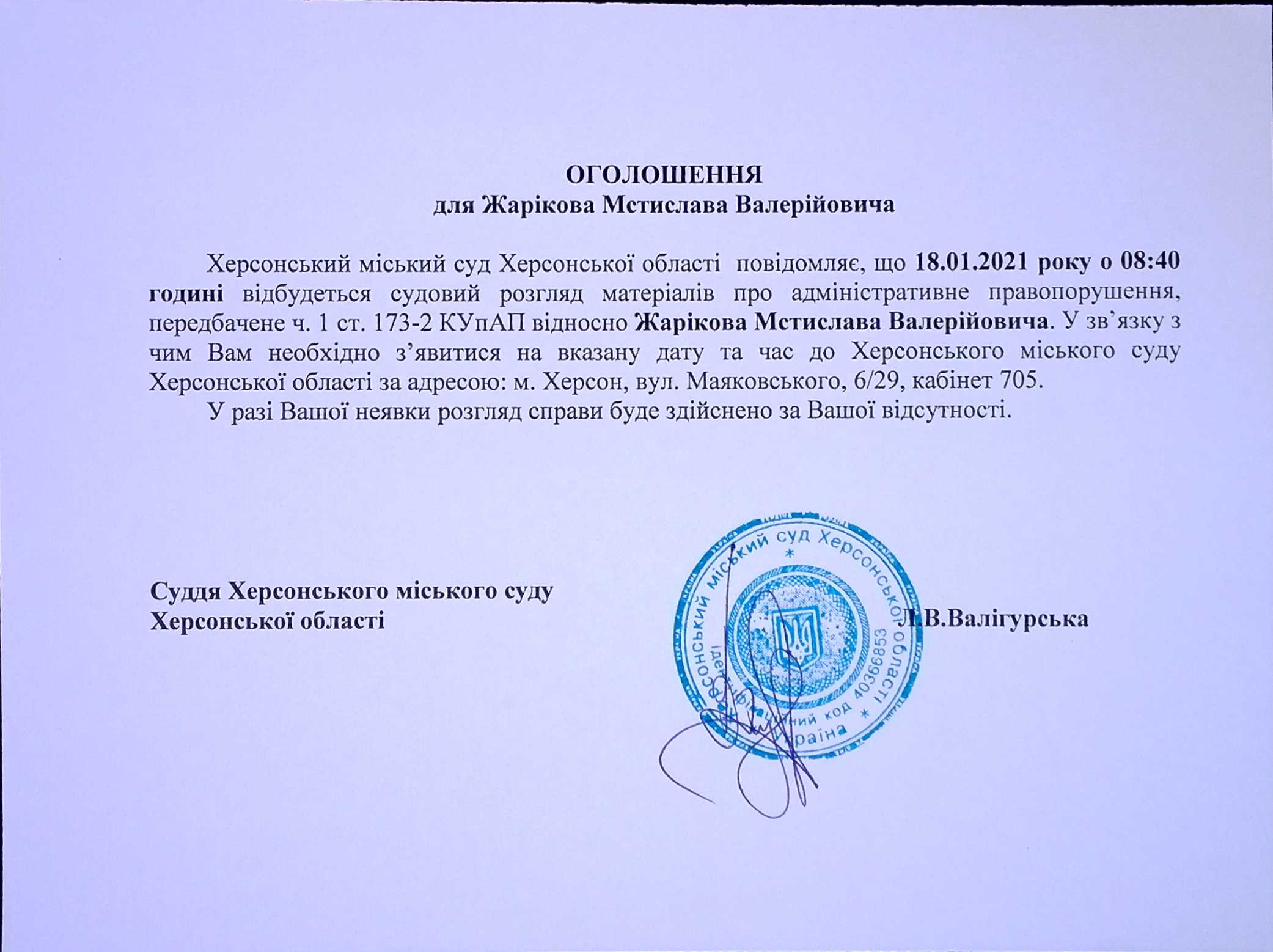 ОГОЛОШЕННЯ для Жарікова Мстислава Валерійовича