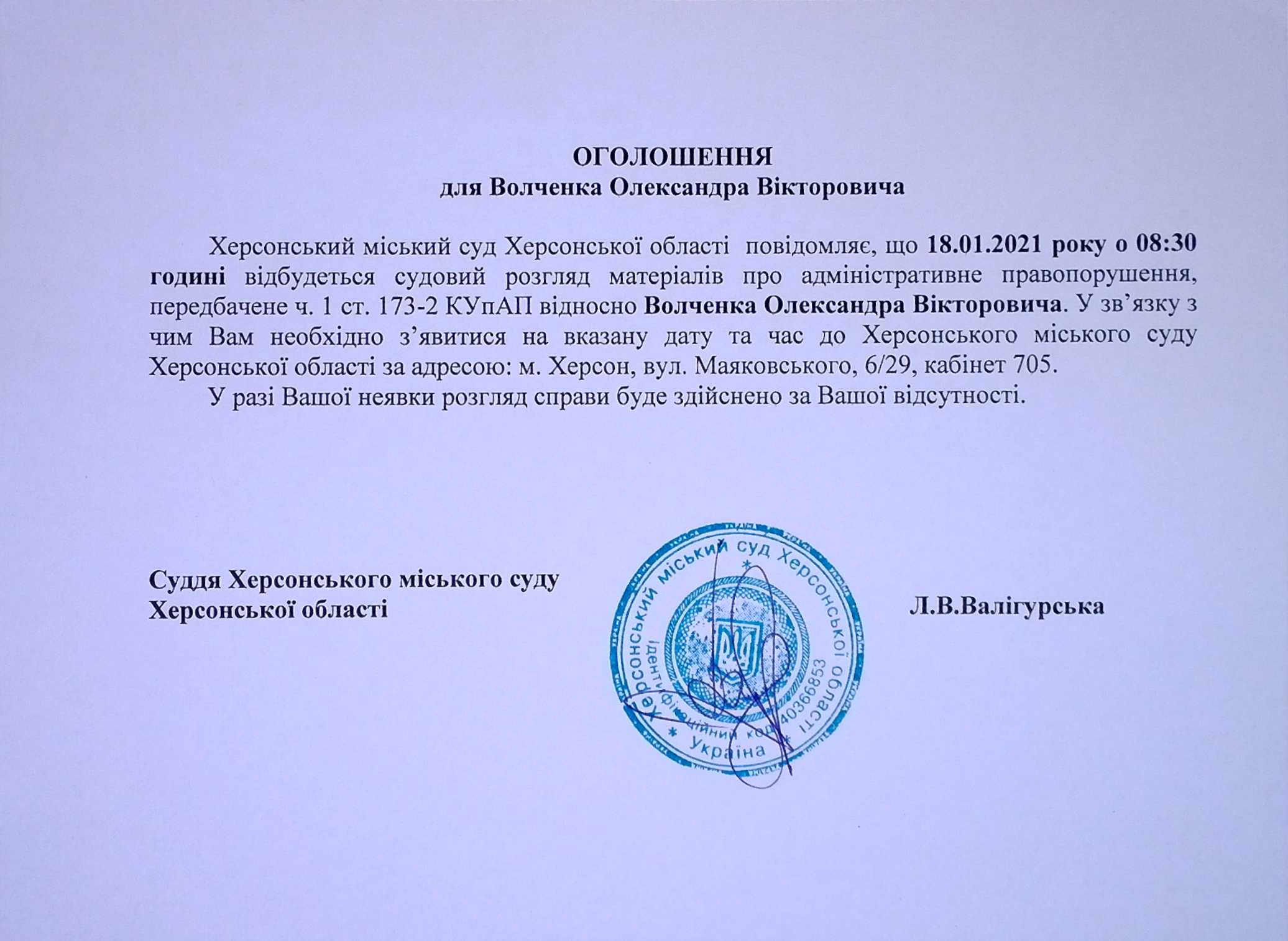 ОГОЛОШЕННЯ для Волченка Олександра Вікторовича