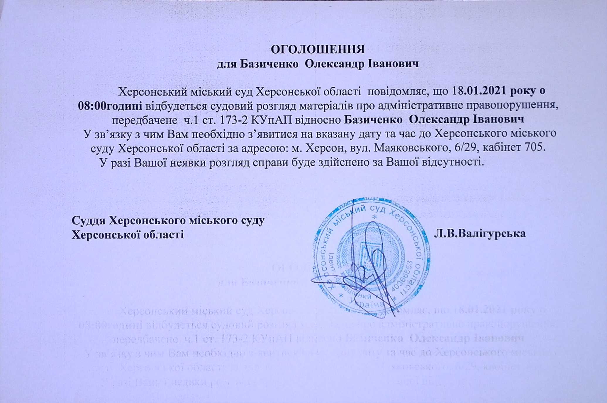 ОГОЛОШЕННЯ для Базиченко Олександра Івановича