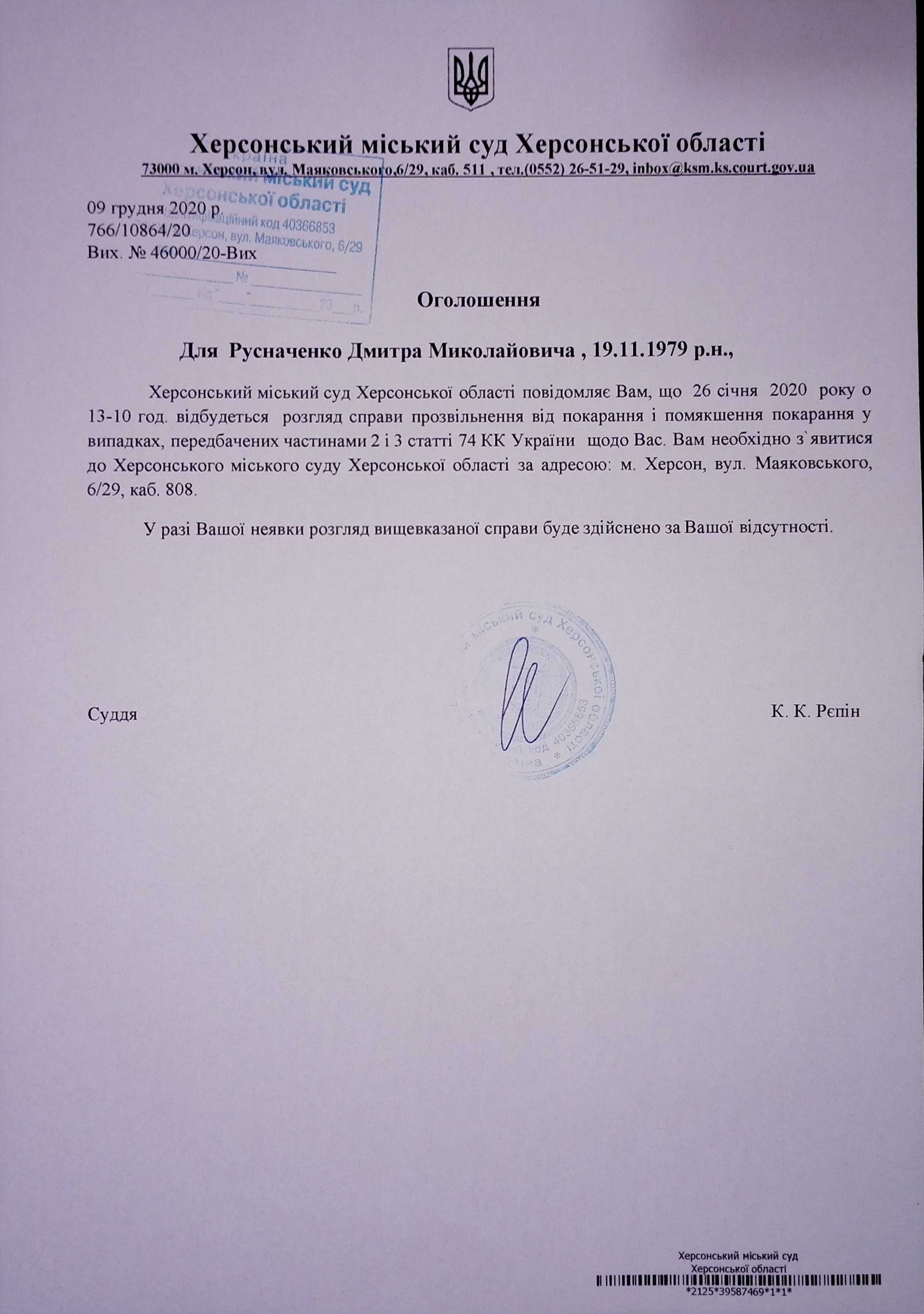 ОГОЛОШЕННЯ для Русначенко Дмитра Миколайовича