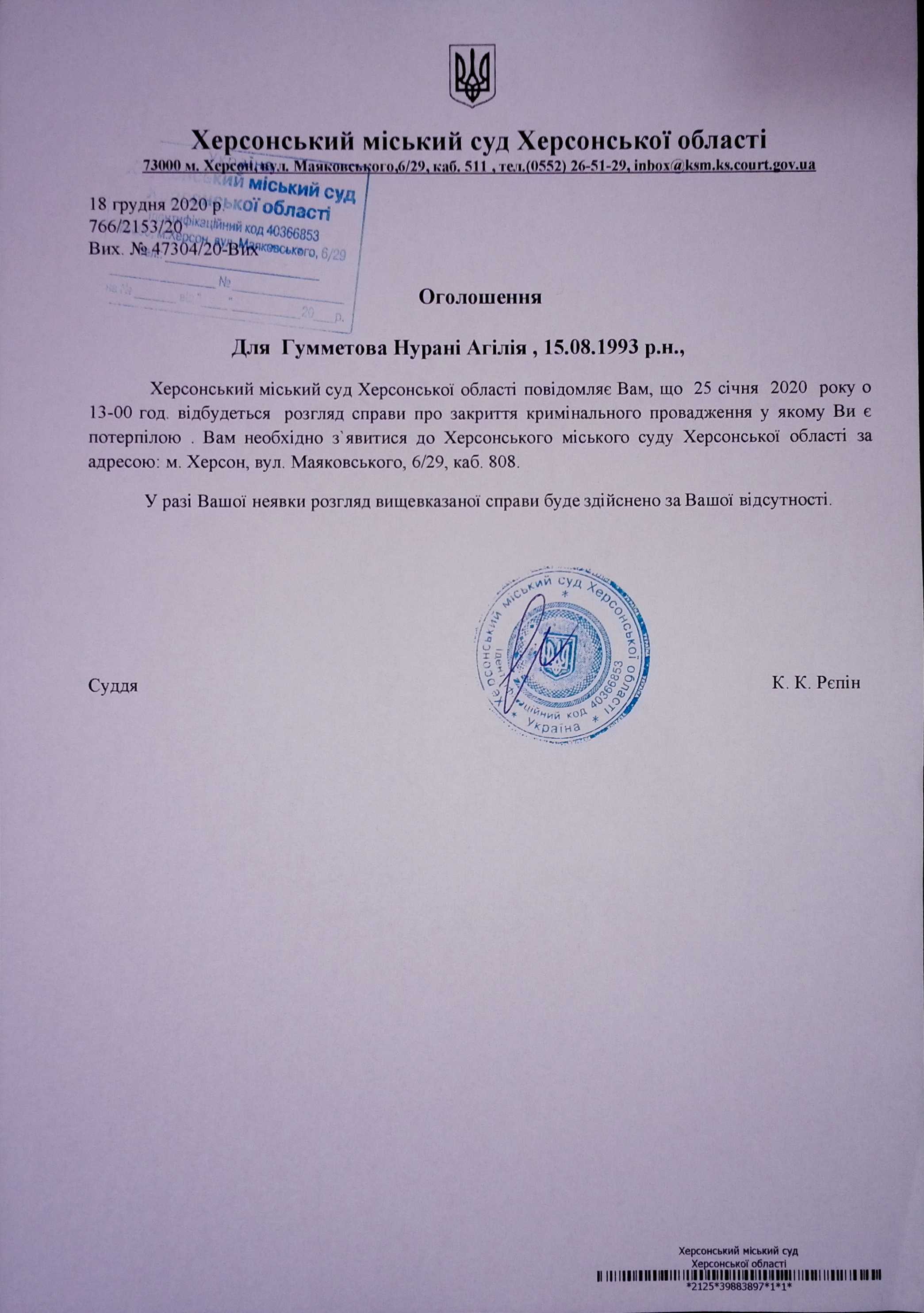ОГОЛОШЕННЯ для Гумметова Нурані Агілія