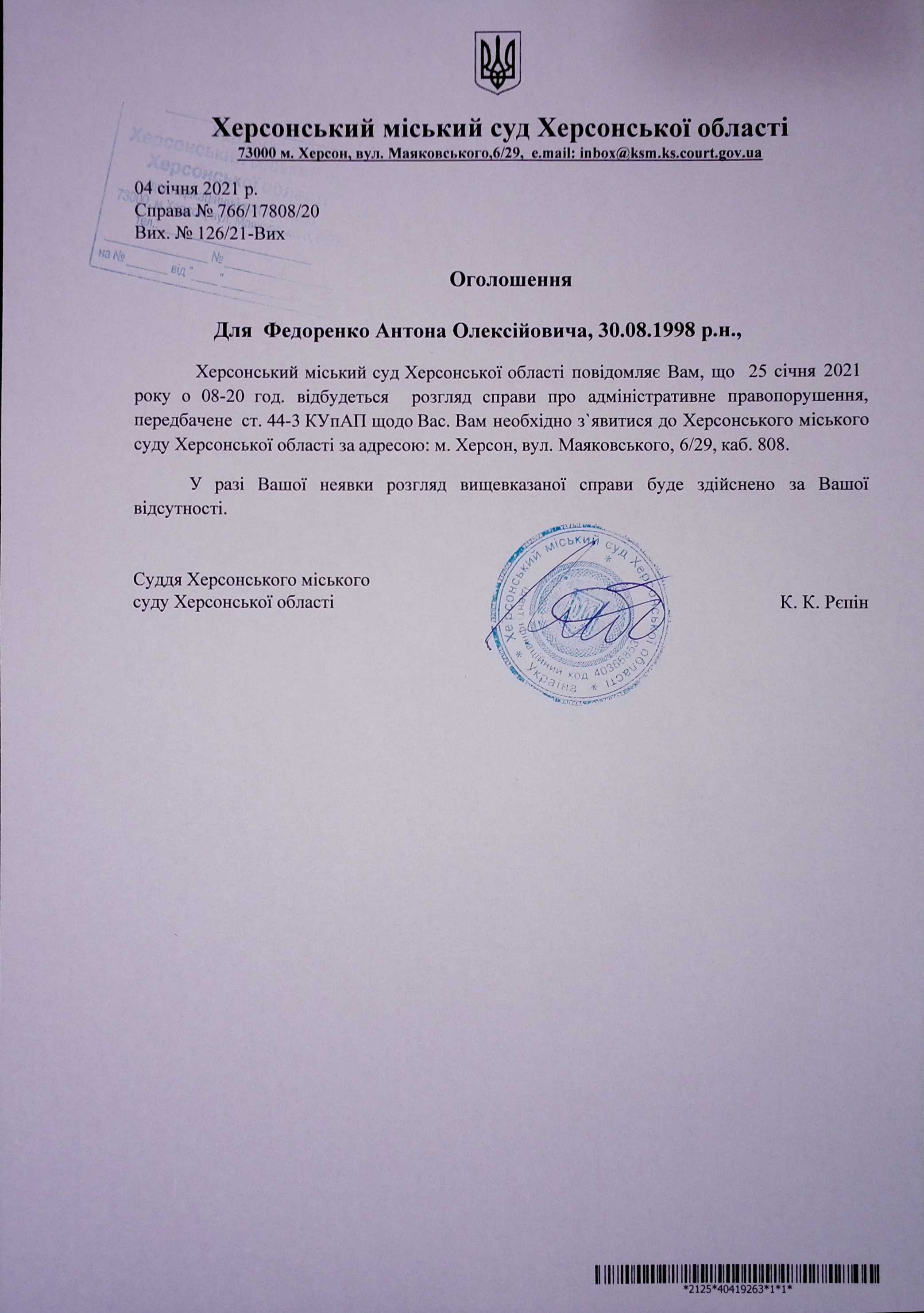 ОГОЛОШЕННЯ для Федоренко Антона Олексійовича