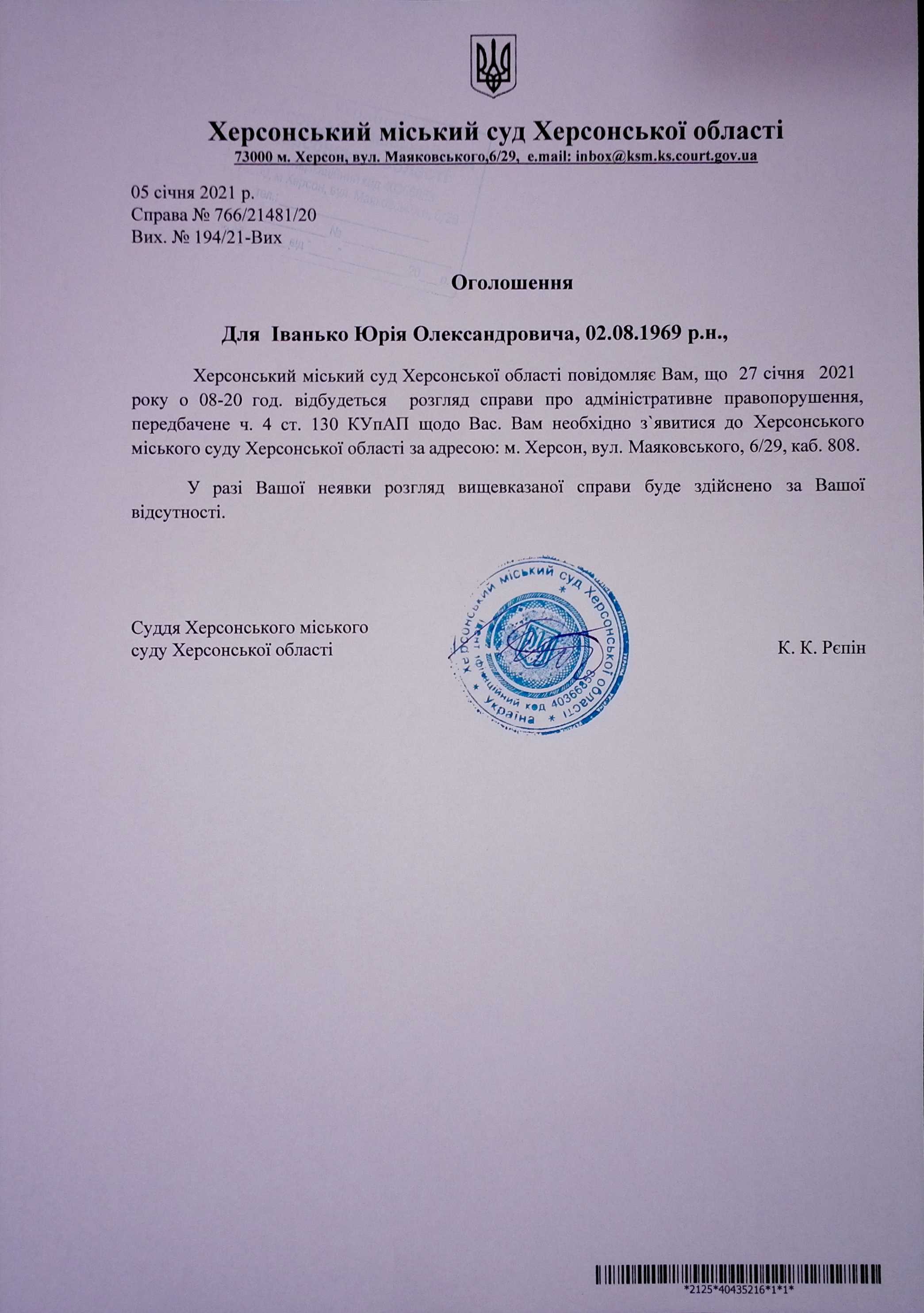 ОГОЛОШЕННЯ для Іванько Юрія Олександровича