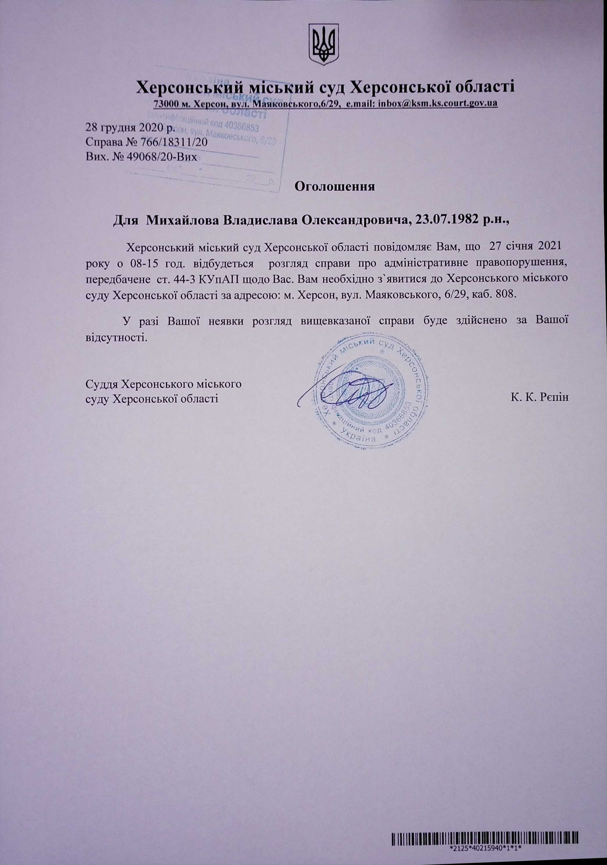 ОГОЛОШЕННЯ для Михайлова Владислава Олександровича
