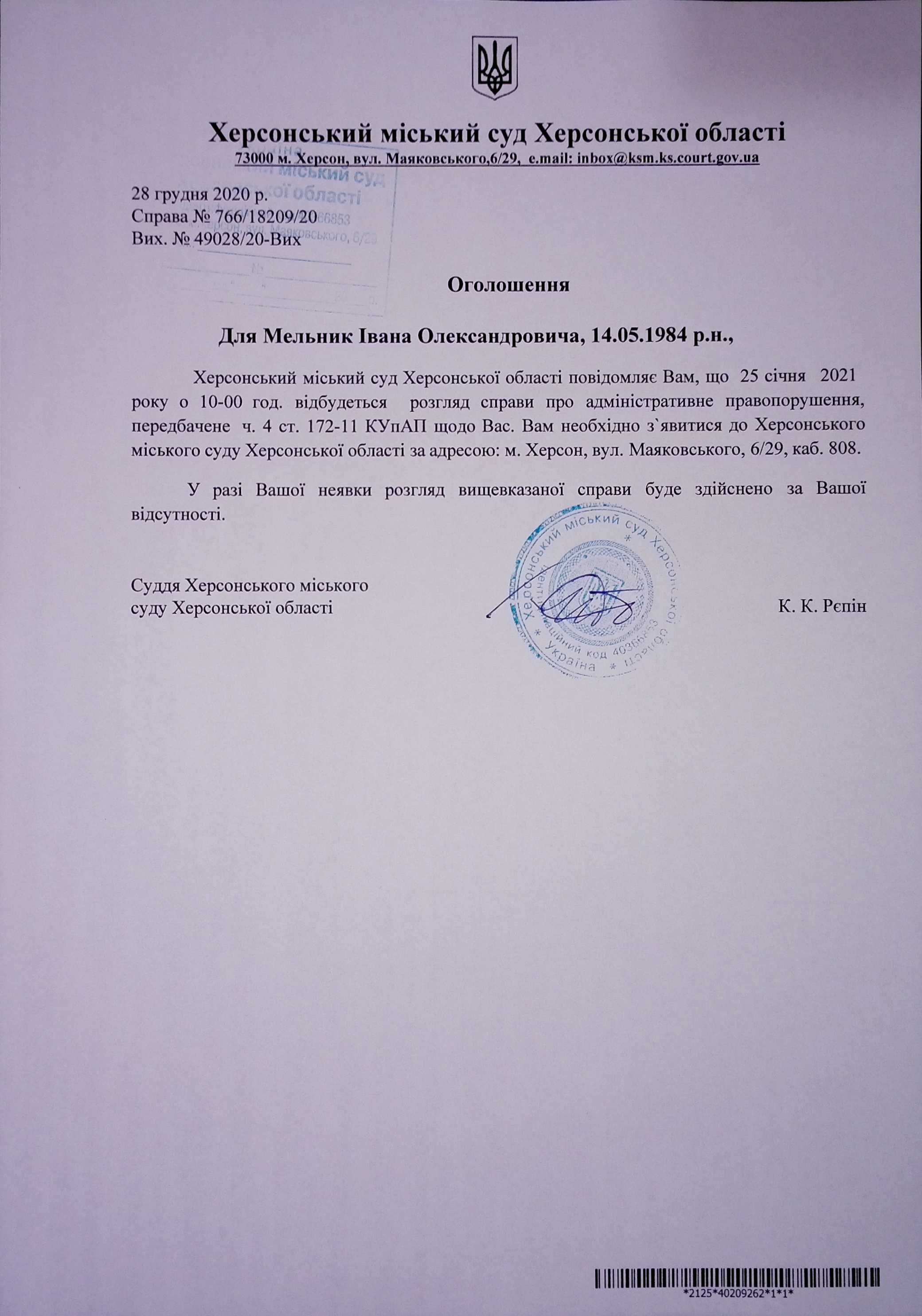 ОГОЛОШЕННЯ для Мельник Івана Олександровича