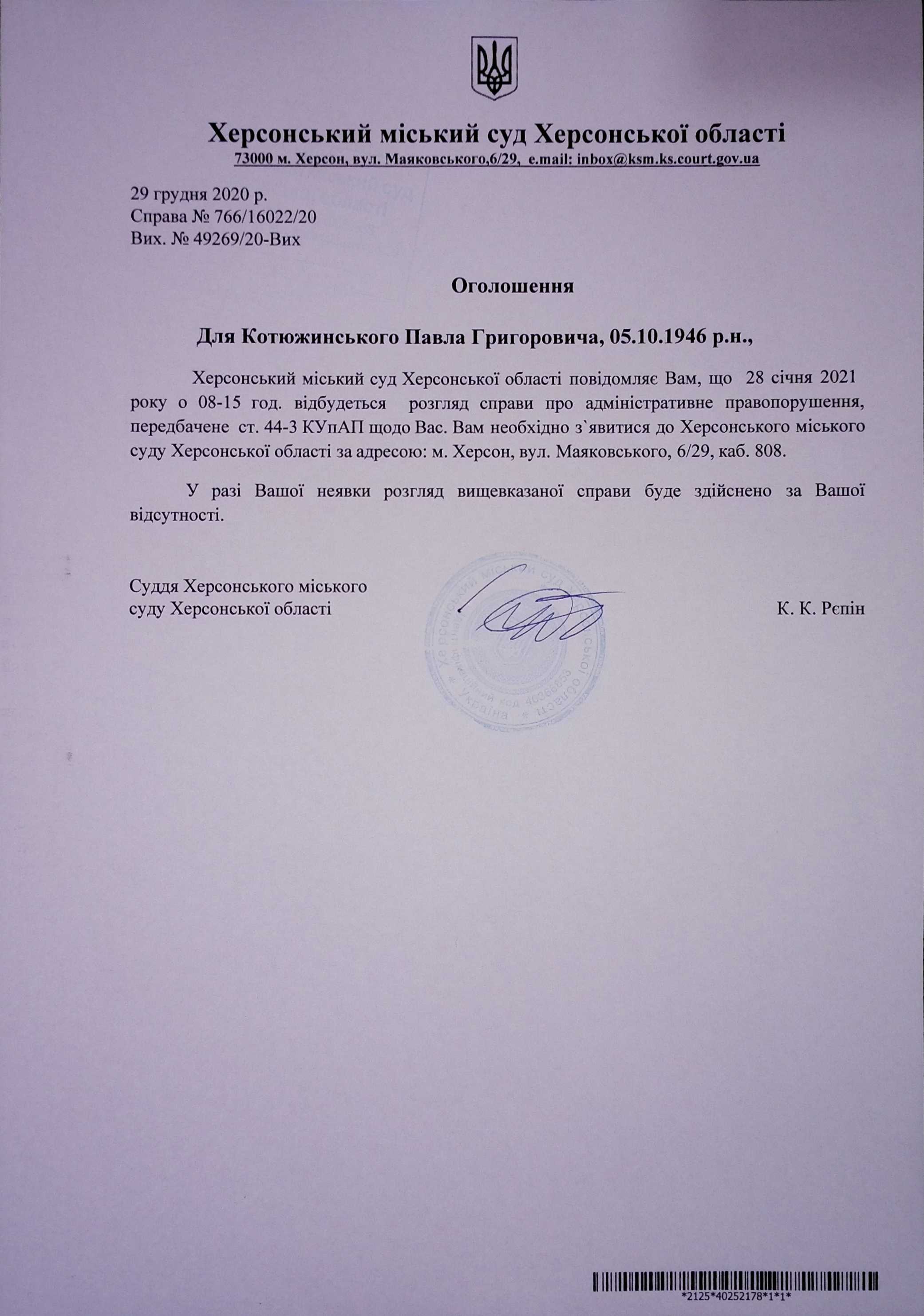 ОГОЛОШЕННЯ для Котюжинського Павла Григоровича