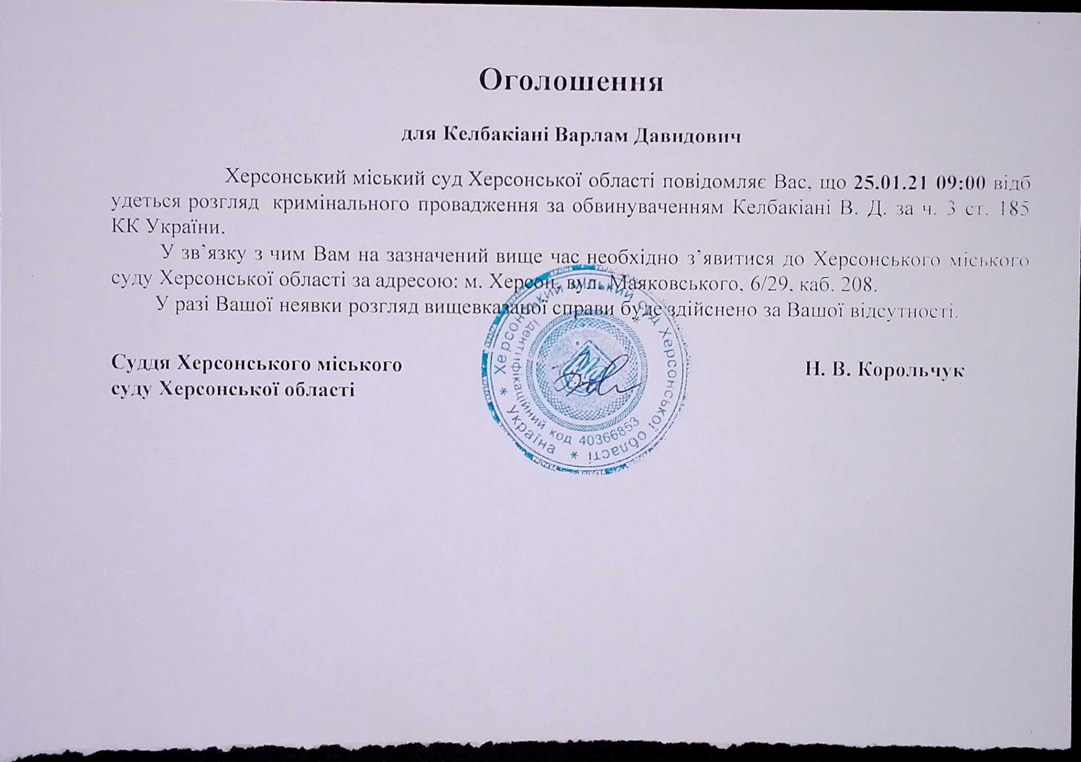ОГОЛОШЕННЯ для Келбакіані Варлам Давидовича