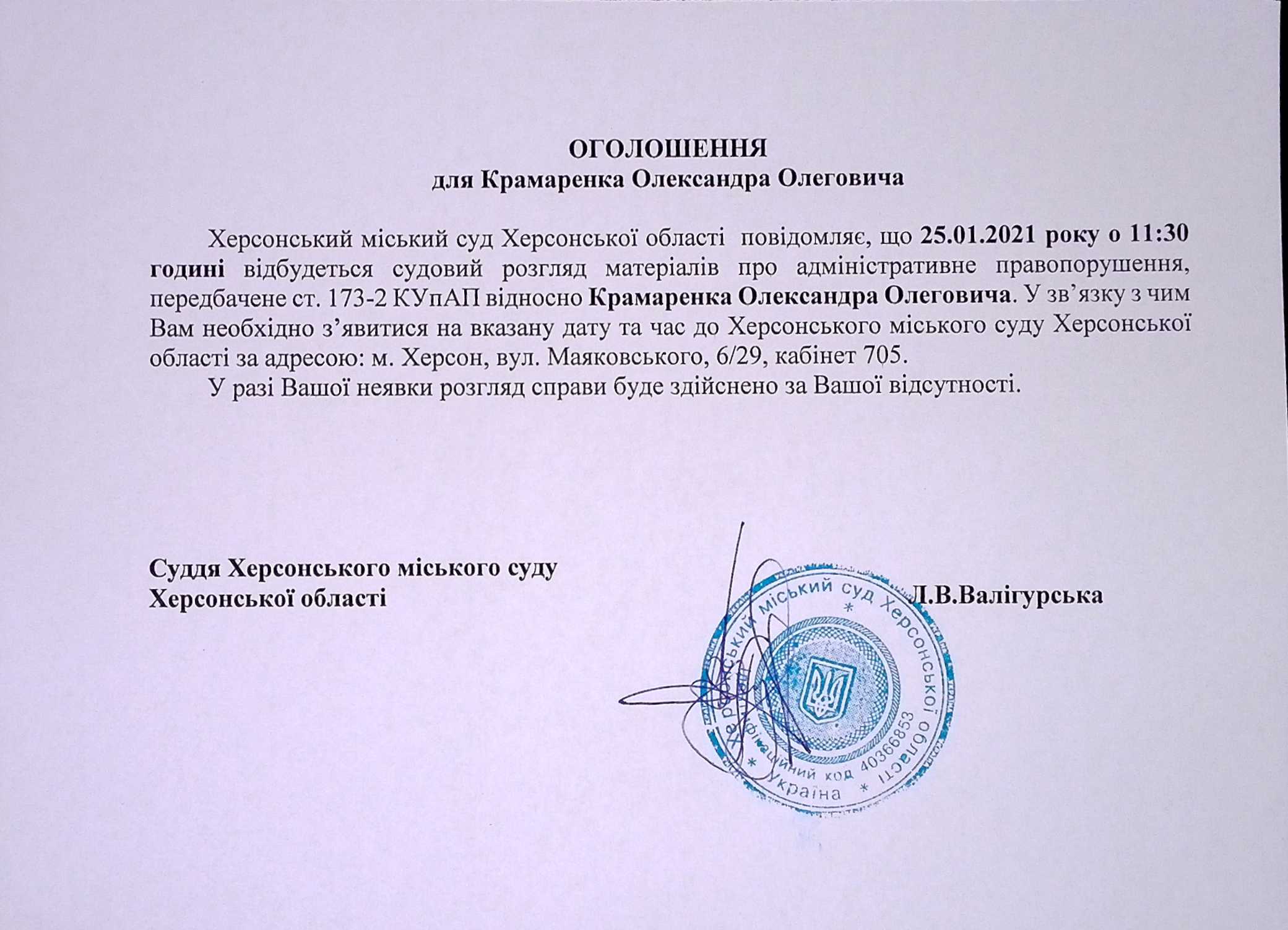 ОГОЛОШЕННЯ для Крамаренка Олександра Олеговича