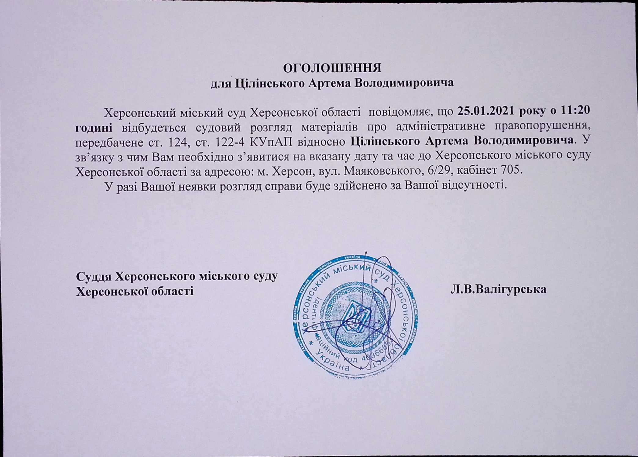 ОГОЛОШЕННЯ для Цілінського Артема Володимровича