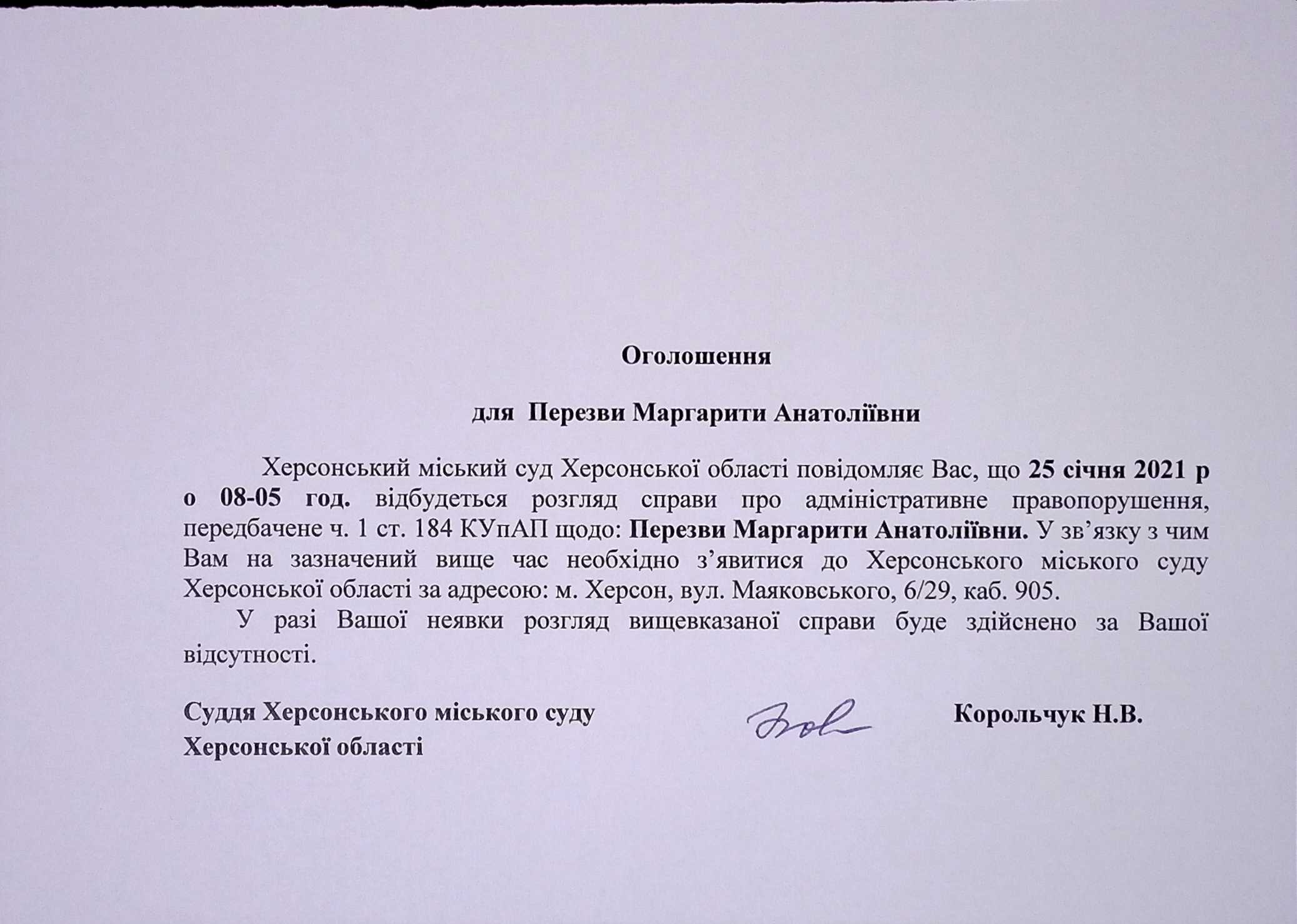 ОГОЛОШЕННЯ для Перезви Маргарити Анатоліївни