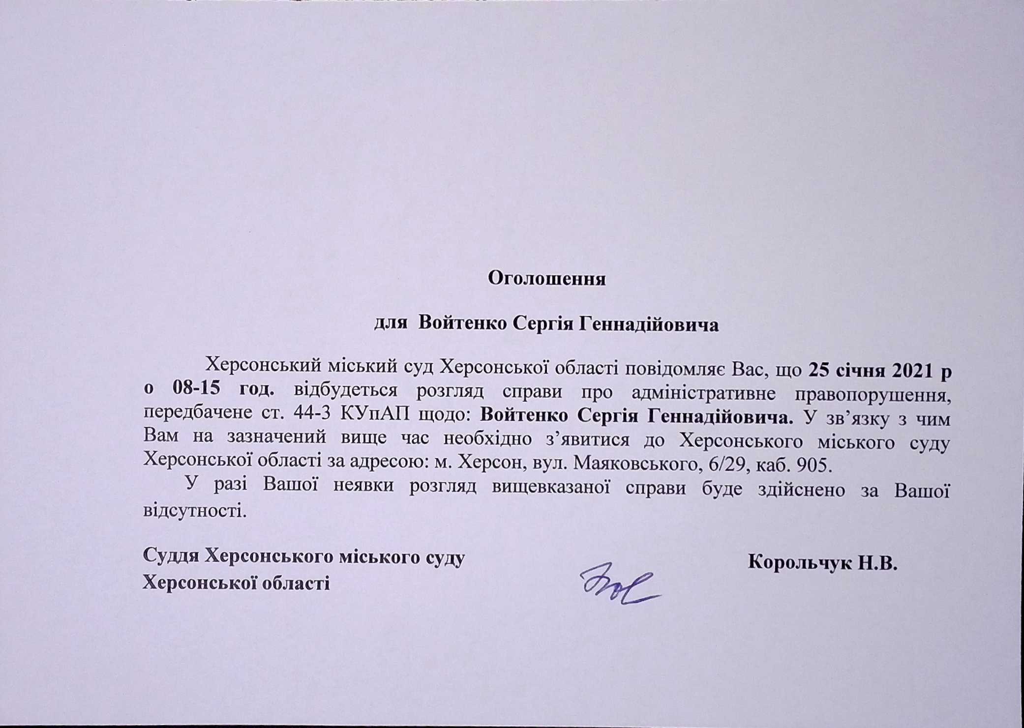 ОГОЛОШЕННЯ для Войтенко Сергія Геннадійовича
