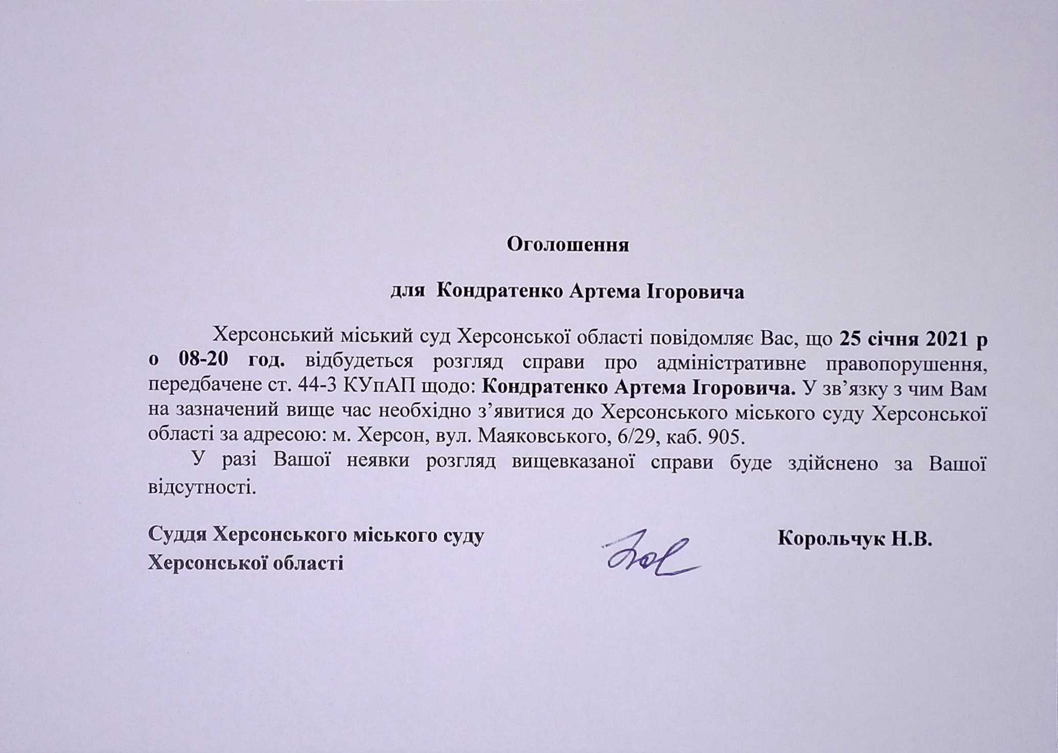 ОГОЛОШЕННЯ для Кондратенко Артема Ігоровича
