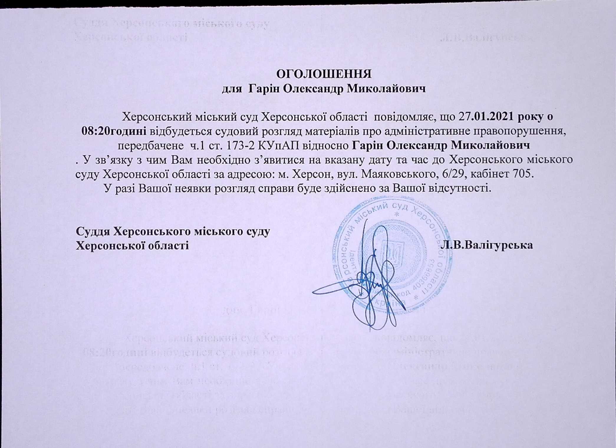 ОГОЛОШЕННЯ для Гаріна Олександра Миколайовича