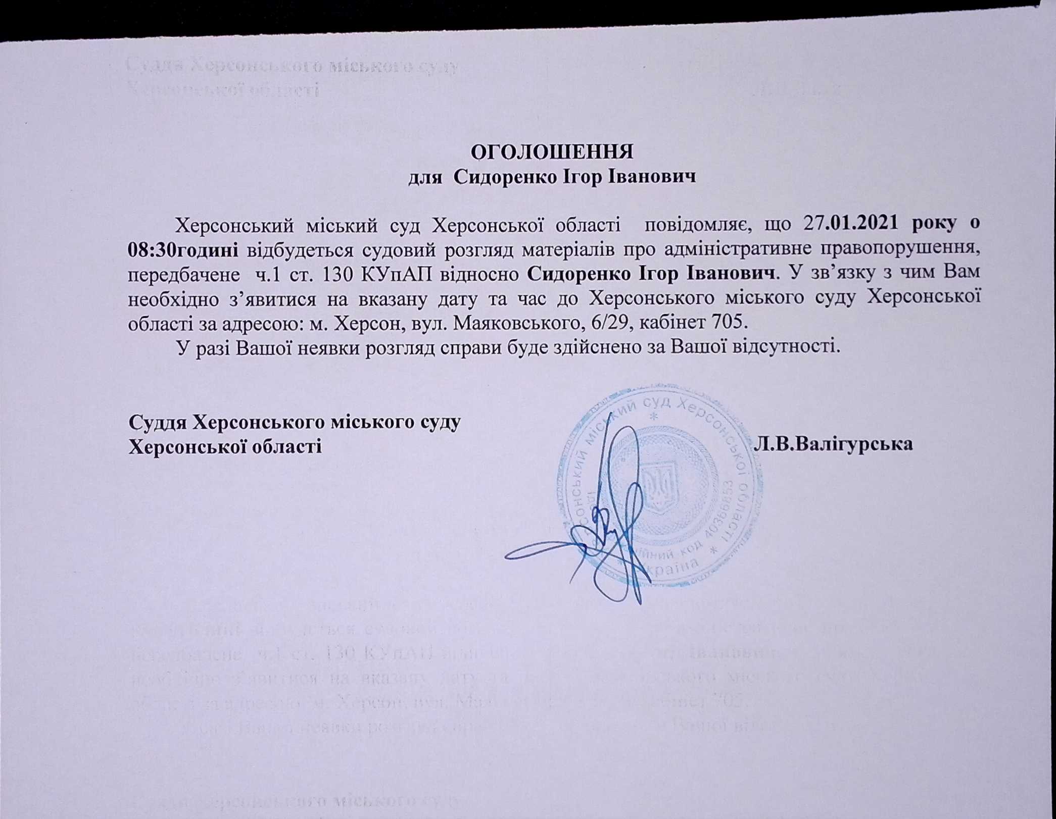 ОГОЛОШЕННЯ для Сидоренко Ігоря Івановича