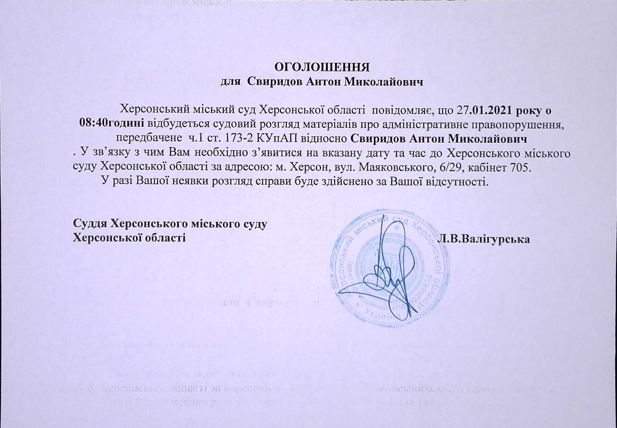 ОГОЛОШЕННЯ для Свиридова Антона Миколайовича