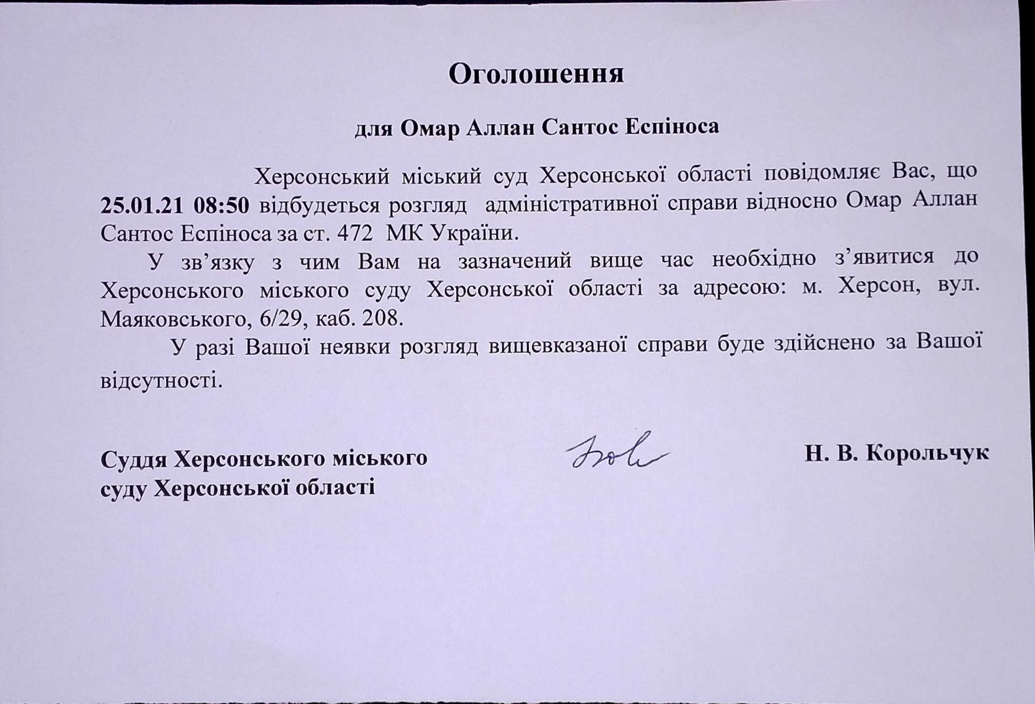 ОГОЛОШЕННЯ для Омар Аллан Сантос Еспіноса