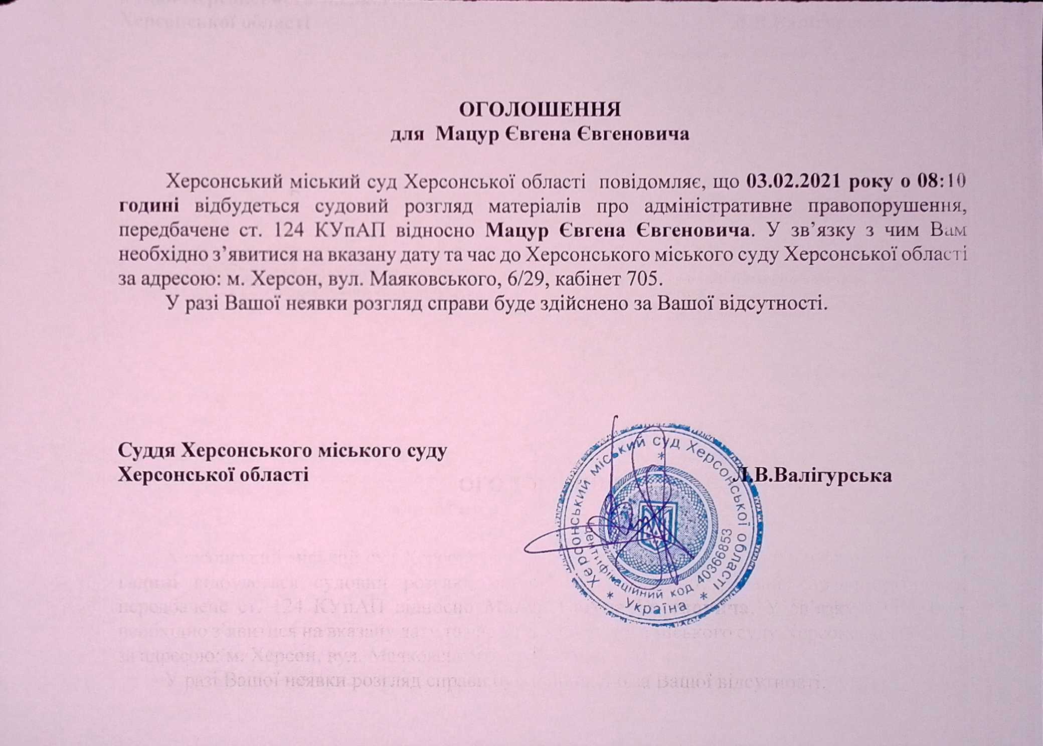 ОГОЛОШЕННЯ для Мацур Євгена Євгеновича